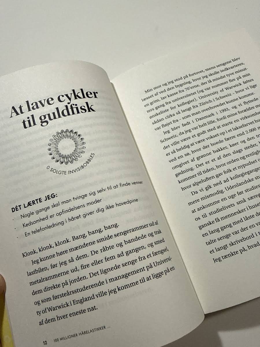 Inspiration til iværksætteren. Da Sophie Trelles-Tvede var atten og studerende, opfandt hun verdens første spiralformede hårelastik, den berømteinvisibobble. Prisen var Sofies opsparing og en masse for-ever-lost-vodka-tonics. I dag er Sofie 28, hun har solgt mere end 100 millioner hårelastikker på verdensplan fordeltpå 85.000 butikker i mere end 70 lande. 100 Millioner hårelastikker og en vodka tonic er et humoristisk og inspirerende behind-the-scenes smugkig ind i Sophies vilde iværksætterliv