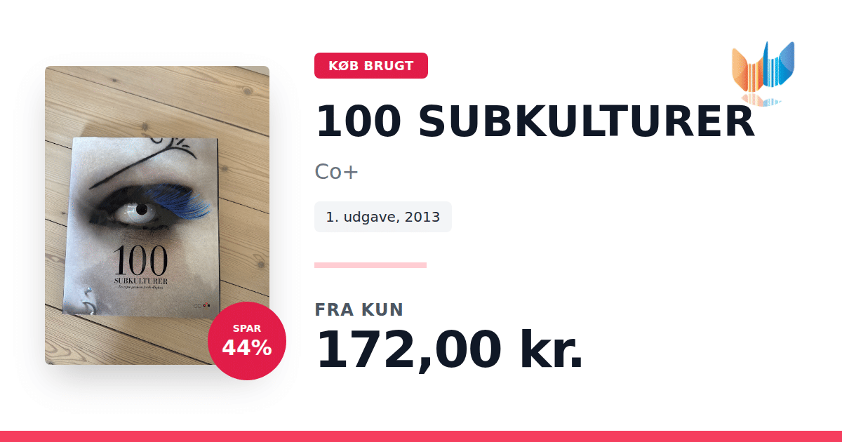 Lige nu kan du købe "100 SUBKULTURER" af Co+ til kun 172,00 kr. Du sparer hele 44% af nyprisen! Bogen du ser her er brugt, og i perfekt stand. Vi har i øjeblikket kun et enkelt eksemplar til salg af "100 SUBKULTURER", så slå til mens du kan!