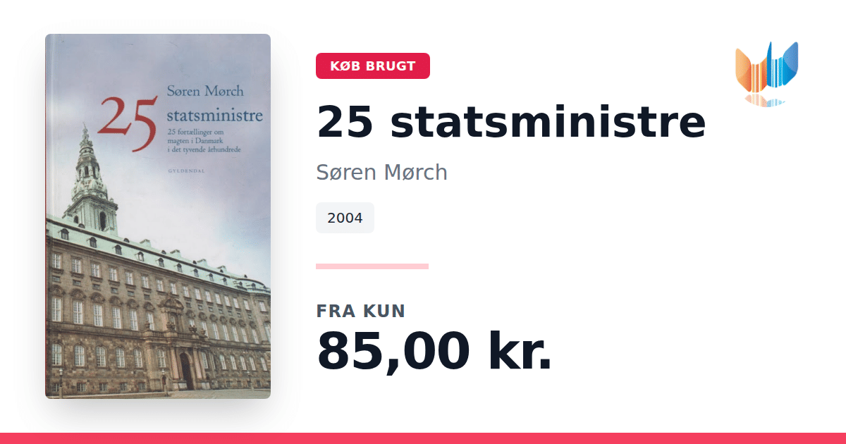 Lige nu kan du købe "25 statsministre" af Søren Mørch til kun 85,00 kr. Bogen du ser her er brugt, og i perfekt stand. Vi har i øjeblikket kun et enkelt eksemplar til salg af "25 statsministre", så slå til mens du kan!