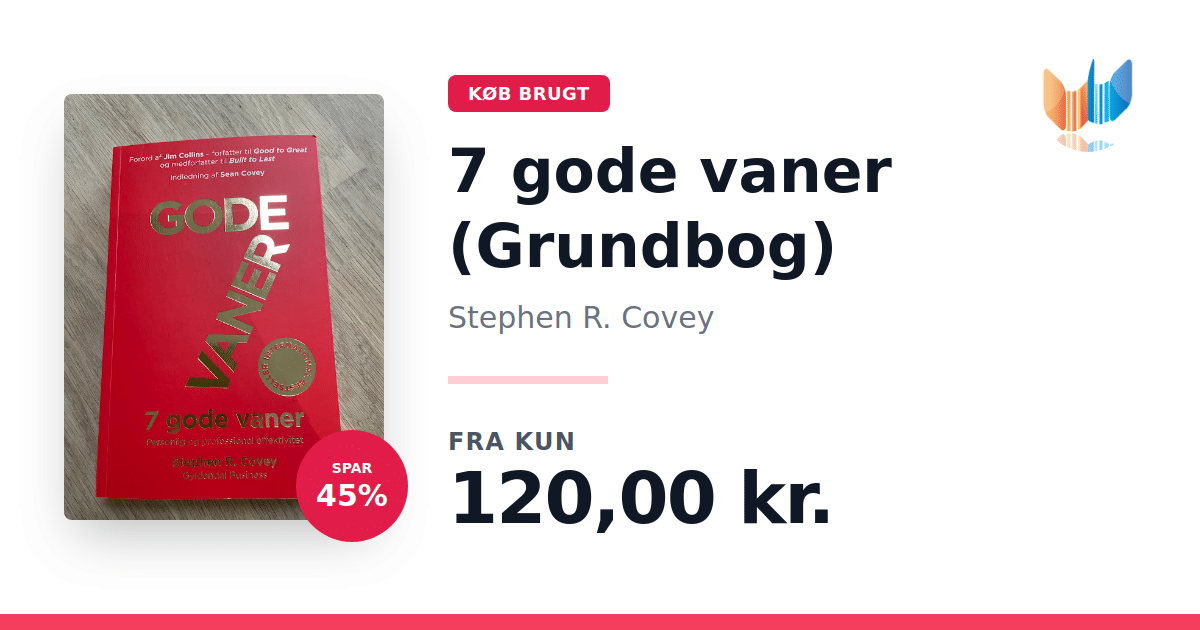 Lige nu kan du købe "7 gode vaner (Grundbog)" af Stephen R. Covey til kun 120,00 kr. Du sparer hele 45% af nyprisen! Bogen du ser her er brugt, og i perfekt stand. Vi har i øjeblikket kun et enkelt eksemplar til salg af "7 gode vaner (Grundbog)", så slå til mens du kan!