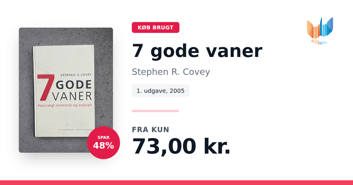 Lige nu kan du købe "7 gode vaner" af Stephen R. Covey til kun 73,00 kr. Du sparer hele 48% af nyprisen! Bogen du ser her er brugt, og i perfekt stand. Vi har i øjeblikket 3 eksemplarer til salg af "7 gode vaner", så husk at se de forskellige udgaver.