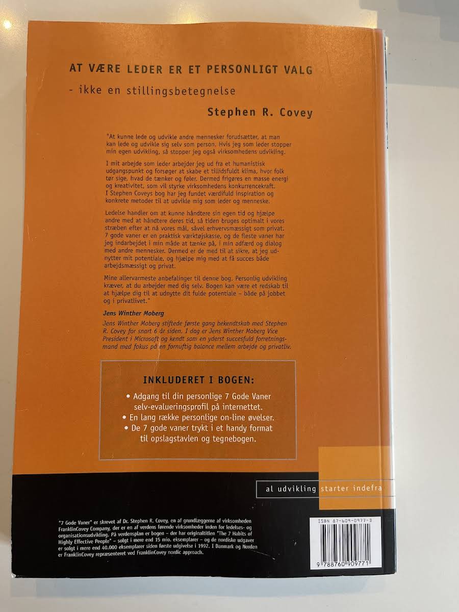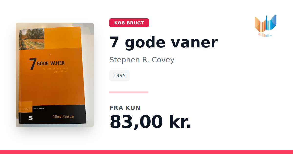 Lige nu kan du købe "7 gode vaner" af Stephen R. Covey til kun 83,00 kr. Bogen du ser her er brugt, og i perfekt stand. Vi har i øjeblikket kun et enkelt eksemplar til salg af "7 gode vaner", så slå til mens du kan!