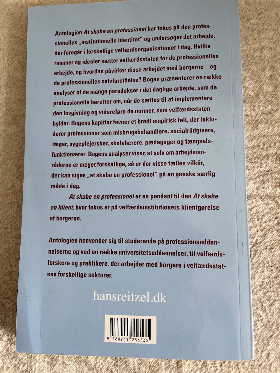 "At skabe en professionel" er en antologi, der dykker ned i den institutionelle identitet og de særlige rammer, som velfærdsstaten sætter for de professionelle. Gennem bidrag fra bl.a. Margaretha Järvinen, Nanna Mik-meyer, Anne Roelsgaard Obling, Helle Bjerg, Hanne Knudsen, Malene Molding Nielsen, Kathrine Vitus, Marie Østergaard Møller, Jens Kofod og Kathrine Hoffmann Pii udfolder bogen, hvordan disse rammer påvirker både arbejdet i velfærdsorganisationer og de professionelle aktørers selvopfattelse. Med et bredt empirisk udsnit, der spænder over områder som socialt arbejde, sundhed, pædagogik og fængselssektoren, giver bogen indblik i de paradokser og dilemmaer, som de professionelle møder i deres daglige praksis. Bogen henvender sig til studerende på professionsuddannelser og universiteter, der beskæftiger sig med forskning i velfærdsinstitutioner, samt til praktikere, der ønsker en dybere forståelse af, hvad der skal til for at forme en professionel i dagens komplekse arbejdsmiljø.