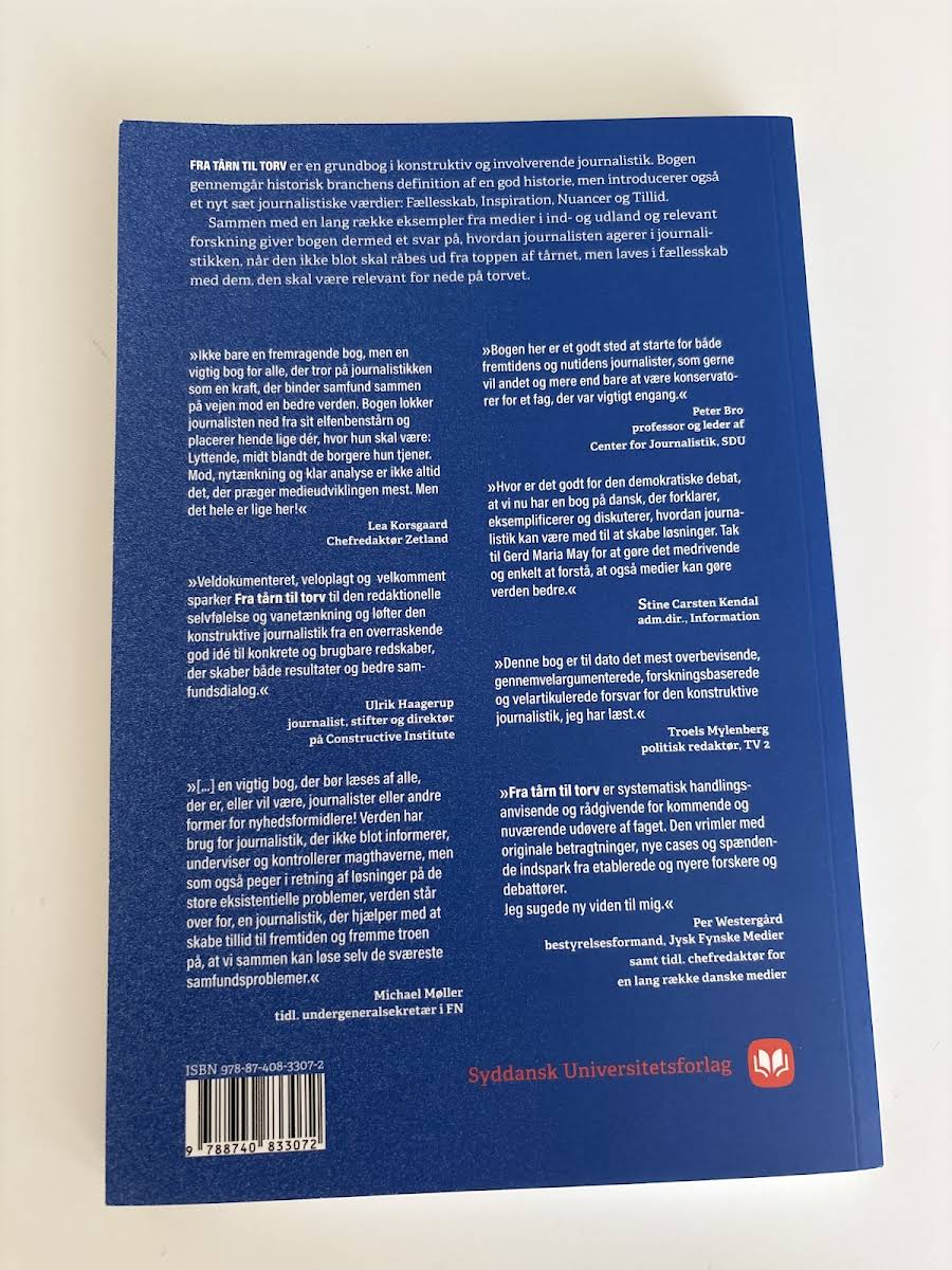 Fra tårn til torv – Journalistens rolle i den involverende og konstruktive journalistik er en grundbog, der udfordrer de traditionelle journalistiske roller. Gerd Maria May præsenterer her et nyt sæt værdier, hvor fællesskab, inspiration, nuancer og tillid sætter dagsordenen for en mere inkluderende mediepraksis. Med et solidt fundament i både historiske perspektiver og aktuelle eksempler fra medier i ind- og udland, viser bogen, hvordan journalister kan bevæge sig væk fra at stå på afstand og i stedet engagere sig direkte med de borgere, de dækker. Gennem relevant forskning og velvalgte cases bliver læseren guidet ind i en journalistik, der handler om dialog og fælles fortællinger. Bogen er en opfordring til at se journalistikken som et redskab for at styrke den demokratiske debat, hvor mod, nytænkning og evnen til at lytte spiller afgørende roller. Fra tårn til torv giver dermed en inspirerende tilgang til, hvordan medier kan bidrage til en mere nuanceret og konstruktiv samfundsudvikling.