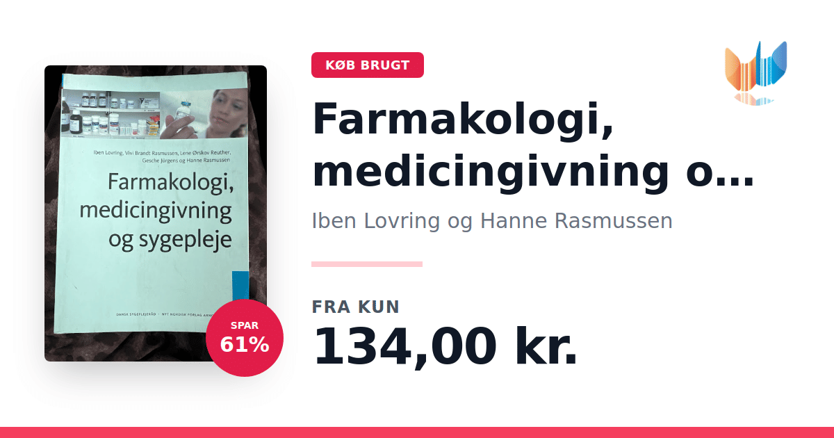 Lige nu kan du købe "Farmakologi, medicingivning og sygepleje" af Iben Lovring og Hanne Rasmussen til kun 134,00 kr. Du sparer hele 61% af nyprisen! Bogen du ser her er brugt, og i perfekt stand. Vi har i øjeblikket 4 eksemplarer til salg af "Farmakologi, medicingivning og sygepleje", så husk at se de forskellige udgaver.