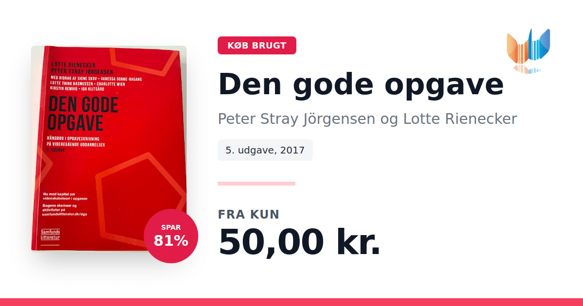 "Den gode opgave" udkommer nu i 5. udgave og er den ubestridte guide for alle studerende, der skal skrive selvstændige og videnskabelige opgaver. I denne udgave har Peter Stray Jörgensen og Lotte Rienecker fået selskab af fem nye medforfattere, som bidrager med deres unikke ekspertise. 5. udgave byder på to nye kapitler – et om videnskabsteori, der belyser, hvordan man omsætter teoretiske overvejelser til praksis, samt et kapitel om litteratur- og informationssøgning, som introducerer de studerende til processen bag en systematisk research. Bogen er fortsat fyldt med konkrete eksempler og aktiviteter, der hjælper den studerende godt på vej i opgaveskrivningen, og har i over 20 år dannet grundlaget for succesfuld akademisk skrivning.