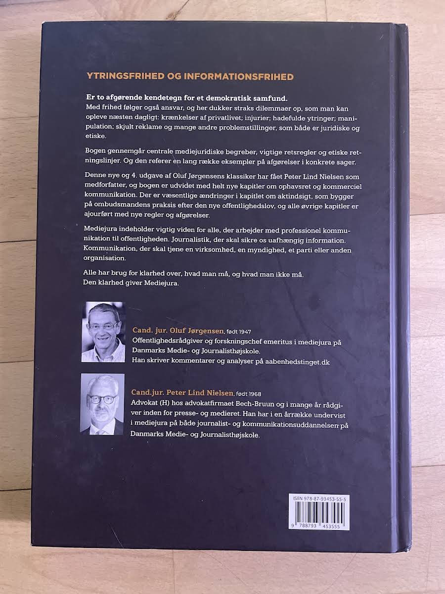 Mediejura – er en central bog for alle, der arbejder med professionel kommunikation og journalistik. Bogen dykker ned i mediejuridikkens kernebegreber, retsregler og etiske retninger, som er afgørende for at sikre både ytrings- og informationsfrihed i et demokratisk samfund. Den belyser de komplekse dilemmaer, der opstår i hverdagen – fra krænkelser af privatlivets fred og injurier til hadefulde ytringer, manipulation og skjult reklame. I den fjerde udgave, udgivet i 2019 og i samarbejde med Peter Lind Nielsen, er der foretaget væsentlige opdateringer og udvidelser. Der er tilføjet nye kapitler om ophavsret og kommerciel kommunikation, og kapitlet om aktindsigt er ajourført med udgangspunkt i ombudsmandens praksis efter den nye offentlighedslov. Mediejura – giver læseren den nødvendige klarhed over, hvad man må, og hvad man ikke må, hvilket gør den til et uundværligt redskab for alle i den kommunikationsmæssige front.