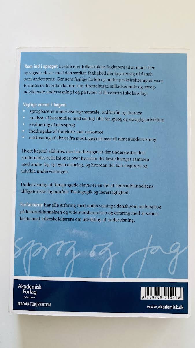 Med "Kom ind i sproget" får folkeskolens lærere et solidt redskab til at møde flersprogede elever med den nødvendige pædagogiske og sprogdidaktiske faglighed. Bogen lægger vægt på, hvordan undervisningen kan tilpasses for at styrke elevernes danske sprogudvikling og samtidig skabe en inkluderende læringskultur, hvor dialog og refleksion går hånd i hånd. Gennem en række praksiseksempler og faglige forløb præsenteres centrale emner som sprogbaseret undervisning med fokus på samtale, ordforråd og literacy, samt evaluering af elevsprog og analyse af læremidler med henblik på sproglig udvikling. Hvert kapitel afsluttes med studieopgaver, der inspirerer til tværfaglige forbindelser og understøtter den enkelte lærers egne erfaringer. Forfatterne Stine Kragholm Knudsen og Lone Wulff trækker på deres mangeårige erfaring med undervisning i dansk som andetsprog i både læreruddannelsen og videreuddannelsen, hvilket giver bogen en praktisk og reflekteret tilgang til et fagligt relevant emne.