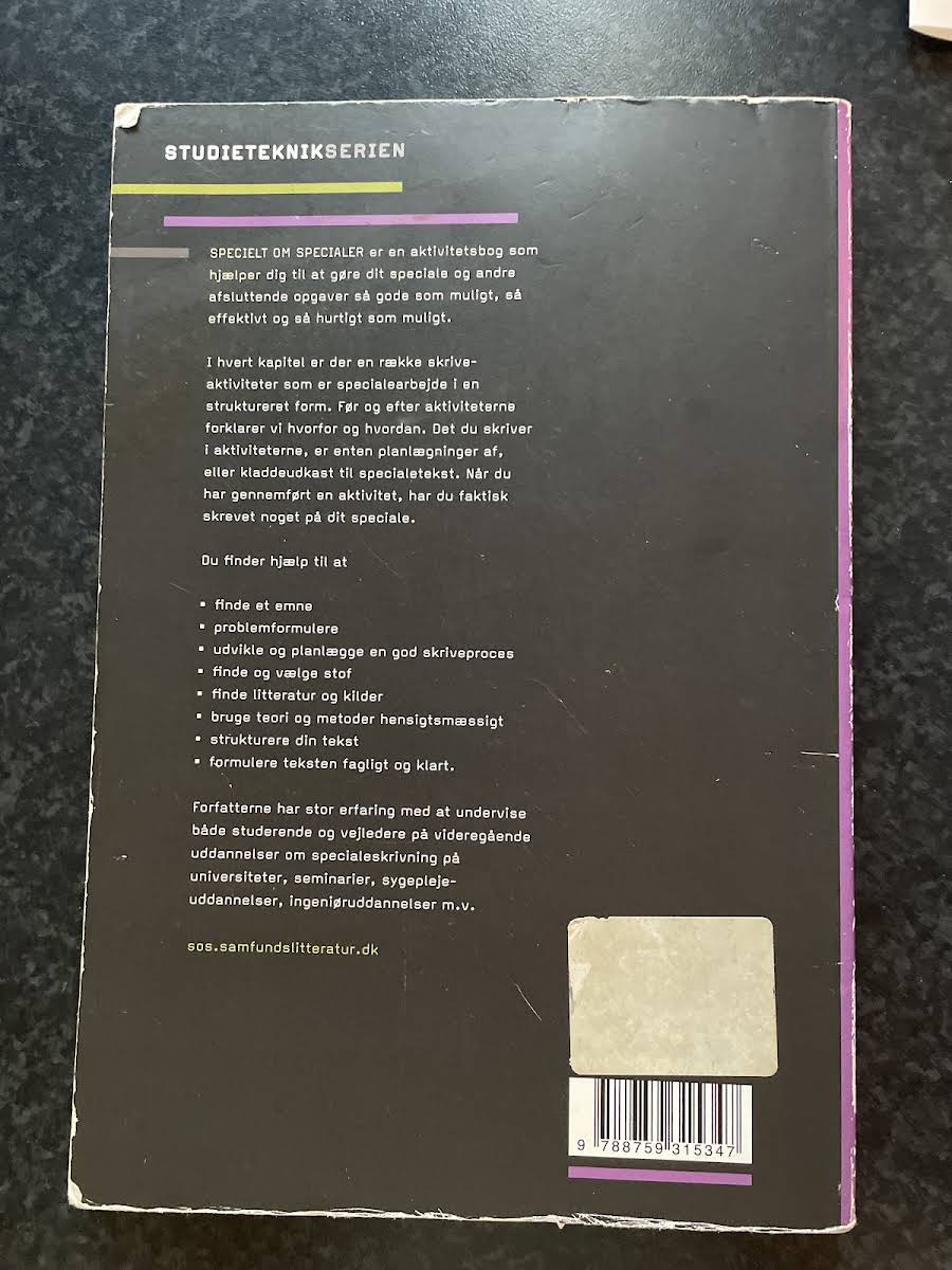 Specielt om specialer er en aktivitetsbog, der er udviklet til studerende, som skal skrive deres afsluttende speciale. Bogen er skabt af Lotte Rienecker, Signe Skov og Peter Stray Jörgensen og bringer et praktisk værktøjssæt til skriveprocessen. Her møder du aktiviteter, der både lægger vægt på læsning, undersøgelser og skrivning, så du kontinuerligt kan omsætte dine ideer til konkrete tekstudkast. I hvert kapitel forklares formålet med både forberedende og efterfølgende øvelser, og du bliver guidet igennem, hvordan du bedst griber processen an. Med en struktureret tilgang til planlægning og skrivning giver bogen dig redskaberne til at imødekomme de krav og forventninger, der stilles til et afsluttende speciale. Specielt om specialer indbyder til en effektiv og målrettet arbejdsproces, hvor hvert skridt bidrager til din samlede specialetekst.