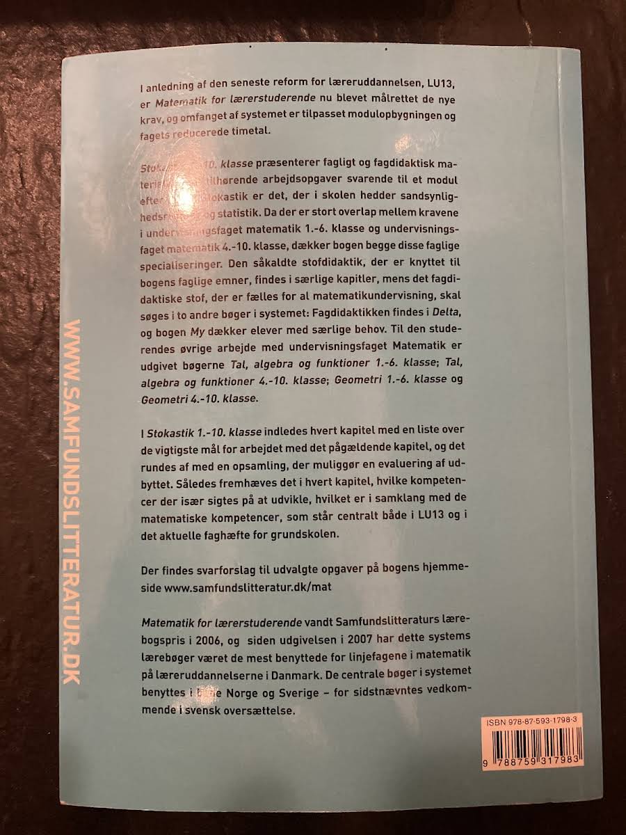 Opdateret i takt med de seneste ændringer i læreruddannelsen byder Matematik for lærerstuderende – Stokastik på et spændende redskab for kommende matematiklærere. Bogen præsenterer et nøje udvalgt fagligt og didaktisk materiale, der svarer til ét modul efter LU13, med særlig fokus på de områder, der i skolen kaldes sandsynlighedsregning og statistik. I arbejdet med stokastik har forfatterne John Schou, Hans-Christian Hansen, Kristine Jess og Jeppe Skott sat ind på både de teoretiske og praktiske problemstillinger, som du møder i undervisningen i matematik for 1.-6. og 4.-10. klasse. Med sine 200 sider er denne paperback et oplagt hjælpemiddel for både den studerende og den praktiserende lærer, der ønsker et solidt udgangspunkt for undervisningen i stokastik.