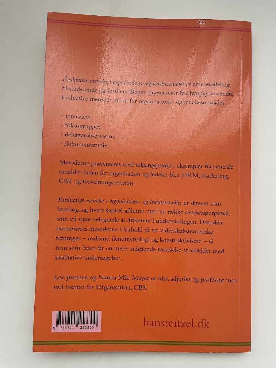 Kvalitative metoder i organisations- og ledelsesstudier er en metodebog for både studerende og forskere, som præsenterer de fire mest anvendte kvalitative metoder inden for organisation og ledelse: interview, fokusgrupper, deltagerobservation og dokumentstudier. Bogen illustrerer metoderne med praktiske eksempler fra centrale områder såsom HRM, marketing, CSR og forvaltningsrevision – og giver dermed et godt udgangspunkt for at forstå, hvordan kvalitative metoder kan anvendes i praksis. Bogen er opbygget som en lærebog, hvor hvert kapitel afsluttes med øvelsesspørgsmål, der inspirerer til refleksion og diskussion. Desuden belyses metoderne ud fra tre videnskabsteoretiske retninger – realisme, fænomenologi og konstruktivisme – hvilket bidrager til en nuanceret tilgang til kvalitative undersøgelser. Lise Justesen og Nanna Mik-Meyer giver med denne udgivelse et værdifuldt redskab til at navigere i organisations- og ledelsesforskningens verden.