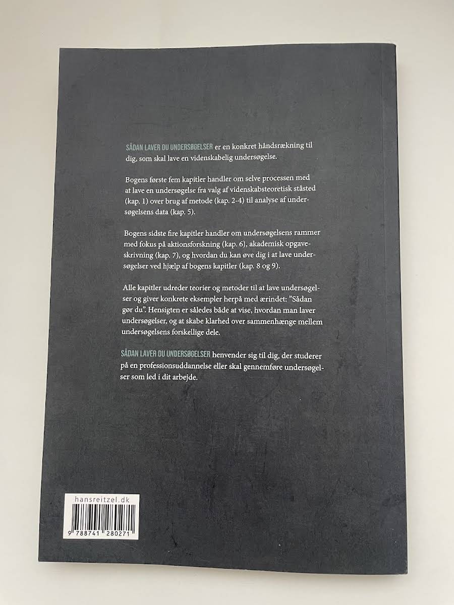 "Sådan laver du undersøgelser" er en praktisk guide, der henvender sig til både studerende på professionsuddannelser og fagfolk, der skal lave undersøgelser som led i deres arbejde. Bogen inspirerer og giver konkrete forslag til, hvordan man fra start til slut kan gribe undersøgelsesprocessen an. I de første kapitler forklares, hvordan man udvælger et videnskabsteoretisk udgangspunkt, anvender metoder og indsamler data, mens de afsluttende kapitler fokuserer på undersøgelsens overordnede rammer. Aktionsforskning, akademisk skrivning og øvelser i praksis præsenteres med klare og håndgribelige eksempler, der gør teorien tilgængelig. Med en kombination af teoretiske indsigter og praktiske råd skaber bogen en helhedsforståelse af, hvordan de enkelte dele af en undersøgelse hænger sammen. Denne sammenhængende tilgang giver læseren redskaberne til både at forstå og udføre undersøgelser på en struktureret og effektiv måde.