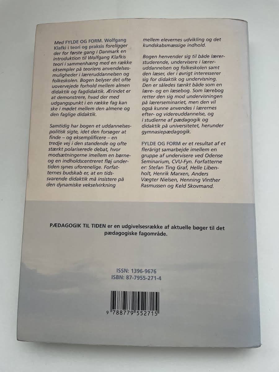 Fylde og form byder læseren velkommen til en dybdegående introduktion til Wolfgang Klafkis didaktiske teori, der for første gang bringes i spil i Danmark. Bogen demonstrerer, hvordan Klafkis tanker kan omsættes i praksis med eksempler fra læreruddannelsen og folkeskolens virkelighed, og viser potentielle krydsfelter mellem almen didaktik og fagdidaktik. Med et klart uddannelsespolitisk sigte udforsker forfatterne, hvordan en harmonisk forening af elevudvikling og det faglige indhold kan være med til at bane vejen for en tredje vej i den ofte polariserede debat mellem børne- og indholdscentrerede tilgange. Denne første udgave af Fylde og form vækker refleksion og inspiration hos både undervisere og studerende, og understreger nødvendigheden af en dynamisk vekselvirkning mellem de pædagogiske metoder.