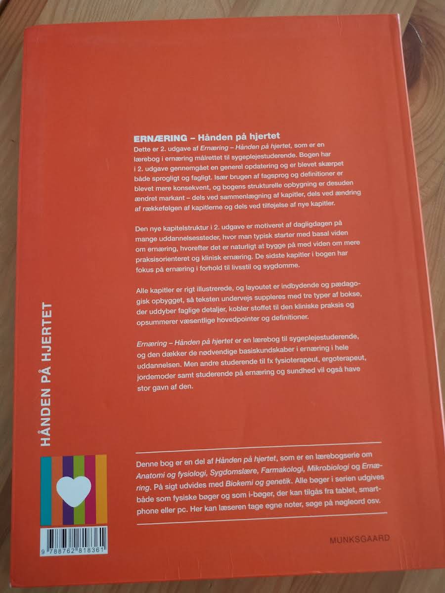 Ernæring – Hånden på hjertet, 2. udgave, udgivet i 2019 og udarbejdet af et anerkendt team af eksperter, er en opdateret og skærpet lærebog, der giver sygeplejestuderende et solidt fundament i ernæringsvidenskab. Med et konsekvent fagsprog og nye, relevante kapitler afspejler bogen den nyeste udvikling inden for ernæring, så den både er pædagogisk og klinisk relevant. I denne udgave er kapitlerne omstruktureret for at skabe en logisk progression, hvor læseren først introduceres til basal ernæringsviden og derefter ledes videre mod praksisnære og kliniske aspekter. Illustrative elementer og tekstbokse med nøgledefinitioner og opklarende information supplerer stoffet, hvilket gør bogen brugervenlig og lærerig for studerende inden for både sygepleje, fysioterapi, ergoterapi, ernæring og sundhed samt jordemoderstuderende. Med sin opdaterede formidling og veltilrettelagte indhold er Ernæring – Hånden på hjertet et uundværligt redskab for alle, der ønsker at opnå en dybdegående forståelse af ernæringens grundprincipper og praktiske anvendelser i sundhedssektoren.
