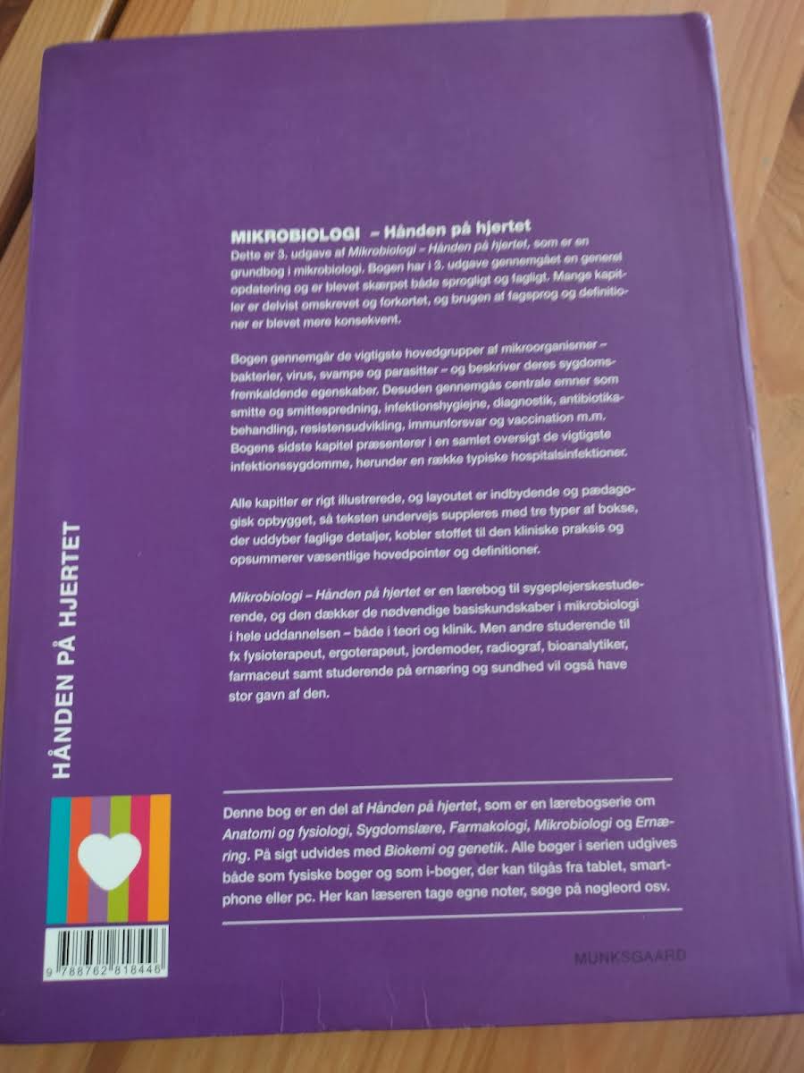 I 3. udgave af Mikrobiologi – Hånden på hjertet er grundbogen i mikrobiologi blevet gennemgået med en omfattende faglig og sproglig opdatering. Mange kapitler er revideret, forkortet og tilpasset med et mere konsekvent fagsprog, så læseren oplever en strømlinet og moderne tilgang til stoffet. Bogen dykker ned i de væsentligste mikroorganismer – herunder bakterier, virus, svampe og parasitter – og belyser deres rolle i sygdomsprocesser. Centrale temaer som smitte, infektionshygiejne, diagnostik, antibiotikabehandling, resistensudvikling, immunforsvar og vaccination behandles grundigt og præcist. Med et indbydende layout, rige illustrationer og specialdesignede bokse, der både forklarer faglige detaljer, relaterer stoffet til klinisk praksis og fremhæver hovedpointer, bliver bogen en uvurderlig ressource. Den er skræddersyet til sygeplejerskestuderende, men er også relevant for studerende inden for fysioterapi, ergoterapi, jordemoder, radiografi, bioanalytik, farmaci samt ernæring og sundhed.