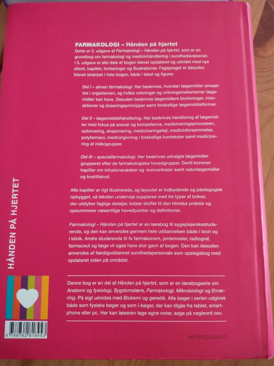 3. udgave af Farmakologi – Hånden på hjertet præsenterer en omfattende og ajourført introduktion til farmakologi og korrekt håndtering af lægemidler. Med 714 sider byder bogen på nye afsnit, kapitler og illustrationer, der hver især understøtter fagsproget og den kliniske relevans. Bogen er inddelt i tre hoveddele, hvor Del I omhandler almen farmakologi med fokus på lægemidlers optagelse, omsætning og virkningsmekanismer i kroppen. Del II fokuserer på modern medicinhåndtering, med vægt på ansvarsområder, doseringsprincipper og forebyggelse af medicineringsfejl i sundhedsvæsenet. Del III dykker ned i specialfarmakologi og giver et detaljeret indblik i de forskellige lægemiddelgruppers særlige egenskaber, herunder praktiske betragtninger om infusionsvæsker, naturlægemidler og kosttilskud. Den pædagogiske opbygning med fokuserede bokse, der fremhæver nøgleinformation og kliniske perspektiver, gør bogen særlig velegnet både til studerende og fagfolk.