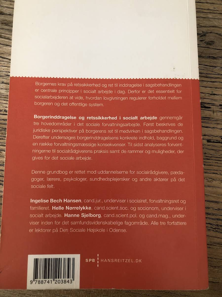 I "Borgerinddragelse og retssikkerhed" sætter Helle Nørrelykke, Ingelise Bech Hansen og Hanne Sjelborg fokus på, hvordan juridiske principper understøtter borgernes ret til aktiv medvirken. Forfatterne giver en grundig gennemgang af de juridiske rammer, som danner udgangspunkt for borgerinddragelse, og belyser, hvordan disse principper omdannes til konkret praksis. Med et solidt juridisk fundament undersøger bogen de forventninger, der stilles til de professionelle aktører inden for sociale fag. Værket henvender sig til studerende og praktikere, som er engagerede i at styrke forbindelsen mellem retssikkerhed og borgerinddragelse, og giver samtidig et værdifuldt indblik i de udfordringer og muligheder, der opstår i krydsfeltet mellem lovgivning og social praksis.