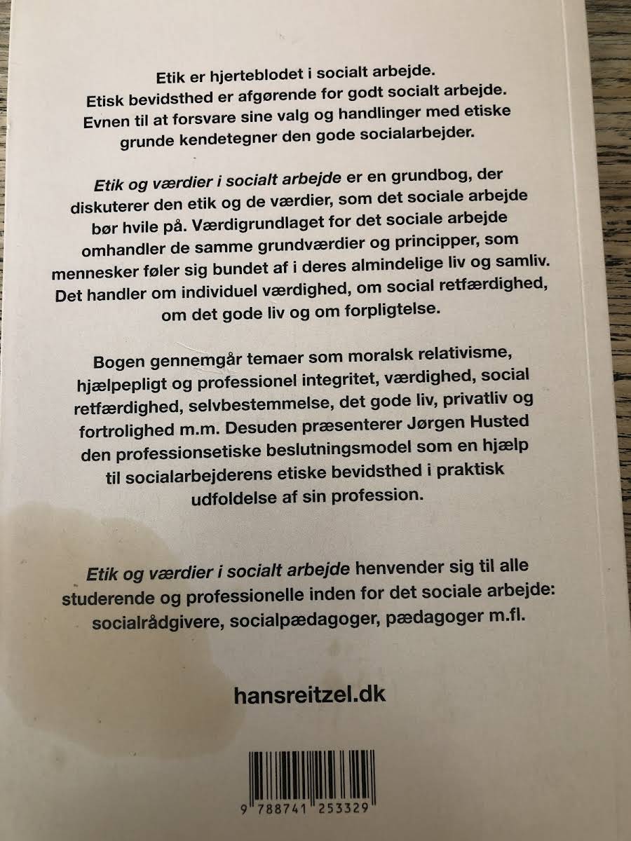 I "Etik og værdier i socialt arbejde" præsenterer Jørgen Husted et grundlag for de etiske overvejelser og værdier, der bør danne fundamentet for det sociale arbejde. Bogen fokuserer på centrale principper som individuel værdighed, social retfærdighed, stræben efter et godt liv og en fornem forpligtethed over for hinanden. Husted argumenterer for, at selv de personer, der befinder sig i samfundets yderkanter, skal have muligheden for at leve et liv med respekt og værdighed. Bogen gennemgår et bredt spektrum af temaer, herunder moralsk relativisme, hjælpepligt, professionel integritet, selvbestemmelse samt privatliv og fortrolighed. Med praktiske eksempler og en klar introduktion til en professionsetisk beslutningsmodel, fungerer værket både som en teoretisk og praktisk guide for dem, der arbejder med socialt udsatte grupper. "Etik og værdier i socialt arbejde" henvender sig til studerende og praktikere inden for socialt arbejde og tilbyder et værdifuldt redskab til at navigere i de etiske dilemmaer, der opstår i hverdagen. Jørgen Husted leverer med denne bog en vigtig diskussion om, hvordan et solidt værdigrundlag kan styrke både den enkelte socialarbejders handlekraft og den samlede sociale indsats.