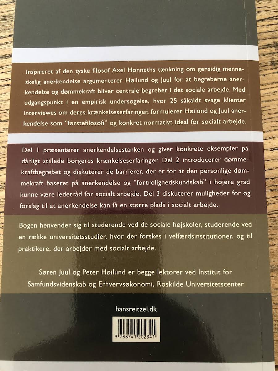 I "Anerkendelse og dømmekraft i socialt arbejde" opstiller Søren Juul og Peter Høilund anerkendelse og dømmekraft som to centrale begreber i det sociale arbejde i Danmark. Ved at tage udgangspunkt i interviews med 25 sårbare klienter, der har oplevet krænkende mønstre, undersøger forfatterne, hvordan disse elementer influerer praksis og relationen mellem hjælper og hjælpelåntager. Med inspiration fra Axel Honneths tænkning om gensidig menneskelig anerkendelse, er bogen struktureret i tre dele. Den første del sætter fokus på anerkendelsestanken og illustrerer den med konkrete eksempler, mens den anden del beskæftiger sig med dømmekraft. I den tredje del præsenteres muligheder og forslag til, hvordan anerkendelse kan få en større plads i det sociale arbejde.
