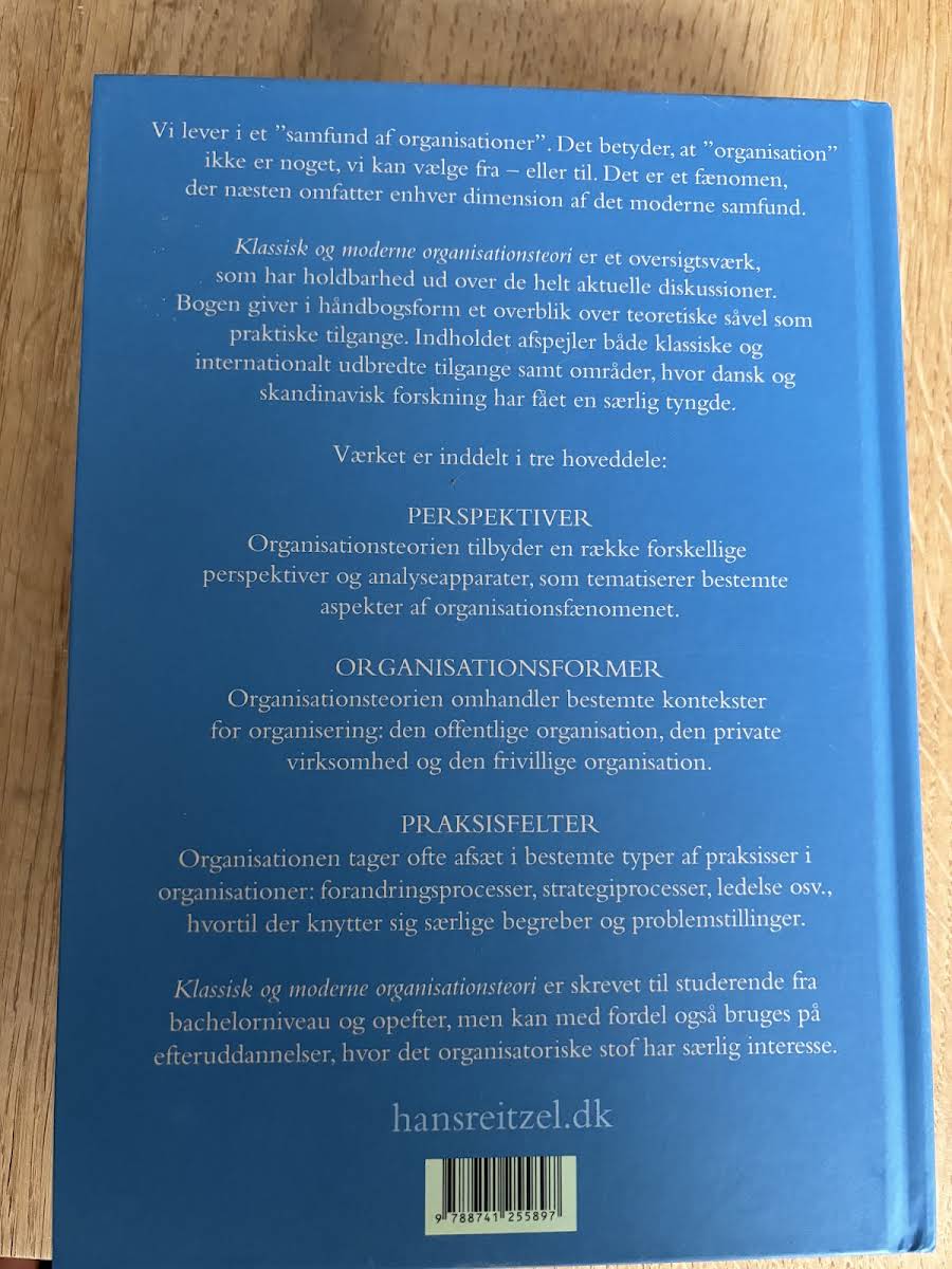 "Klassisk og moderne organisationsteori" er et omfattende værk, der giver et indsigtsfuldt overblik over de teoretiske og praktiske delfelter inden for organisationsteori. Bogen præsenterer både klassiske teorier og internationalt anerkendte perspektiver, hvilket gør den velegnet som et opslagsværk, hvor man nemt kan sætte de forskellige teorier op imod hinanden. Med en håndbogsagtig tilgang er indholdet struktureret, så det både tilgodeser den studerende på bachelorniveau og den, der søger efteruddannelse inden for feltet. Bogen lægger vægt på at kombinere tidløse teoretiske fundamenter med moderne diskussioner, der afspejler de aktuelle strømninger i forskningen. Læsere tilbydes et redskab, hvor de kan navigere i og reflektere over de mange aspekter af organisationsteorien – fra de traditionelle til de mere nutidige perspektiver, der også indbefatter danske og skandinaviske bidrag.