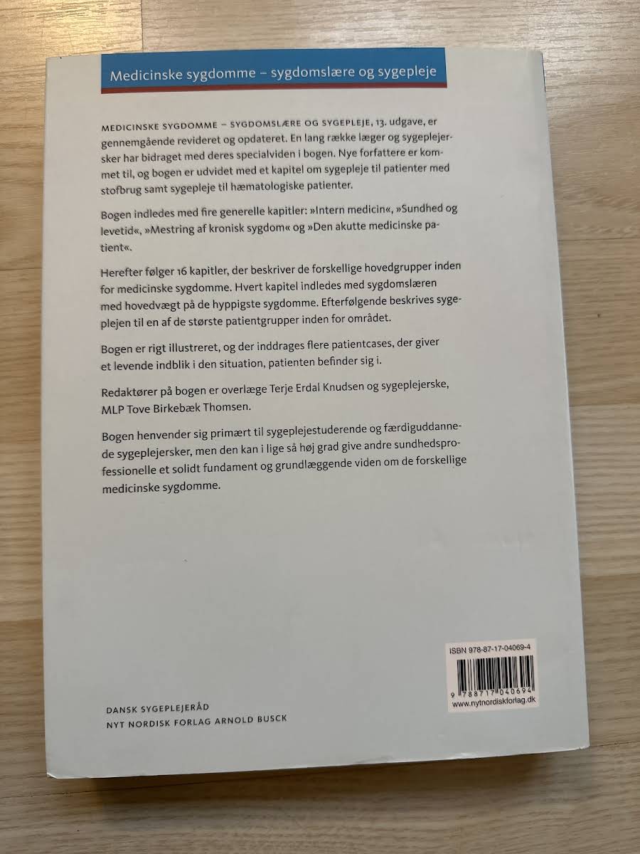 "Medicinske sygdomme" er en grundig og aktuelt revideret lærebog inden for sygdomslære og sygepleje, der henvender sig til både sygeplejestuderende og praktiserende sygeplejersker. Denne 13. udgave er udarbejdet af et bredt ekspertteam bestående af læger og sygeplejersker, der tilsammen bidrager med specialiseret viden og erfaring. Bogen tilbyder en struktureret tilgang til intern medicin, med indledende kapitler om sundhed, levetid, mestring af kroniske sygdomme og den akutte medicinske patient. Herefter følger en række kapitler, der fokuserer på de mest hyppige medicinske sygdomme og den tilhørende sygepleje, understøttet af levende og illustrative patientcases. Med rige illustrationer og en klar formidling af viden, styrker "Medicinske sygdomme" sundhedsprofessionelles fundament, så de bedre kan håndtere de komplekse problemstillinger i det moderne plejemiljø. Bogen er udgivet af Munksgaard i 2010 og fås i paperback-format med et indhold på 575 sider.