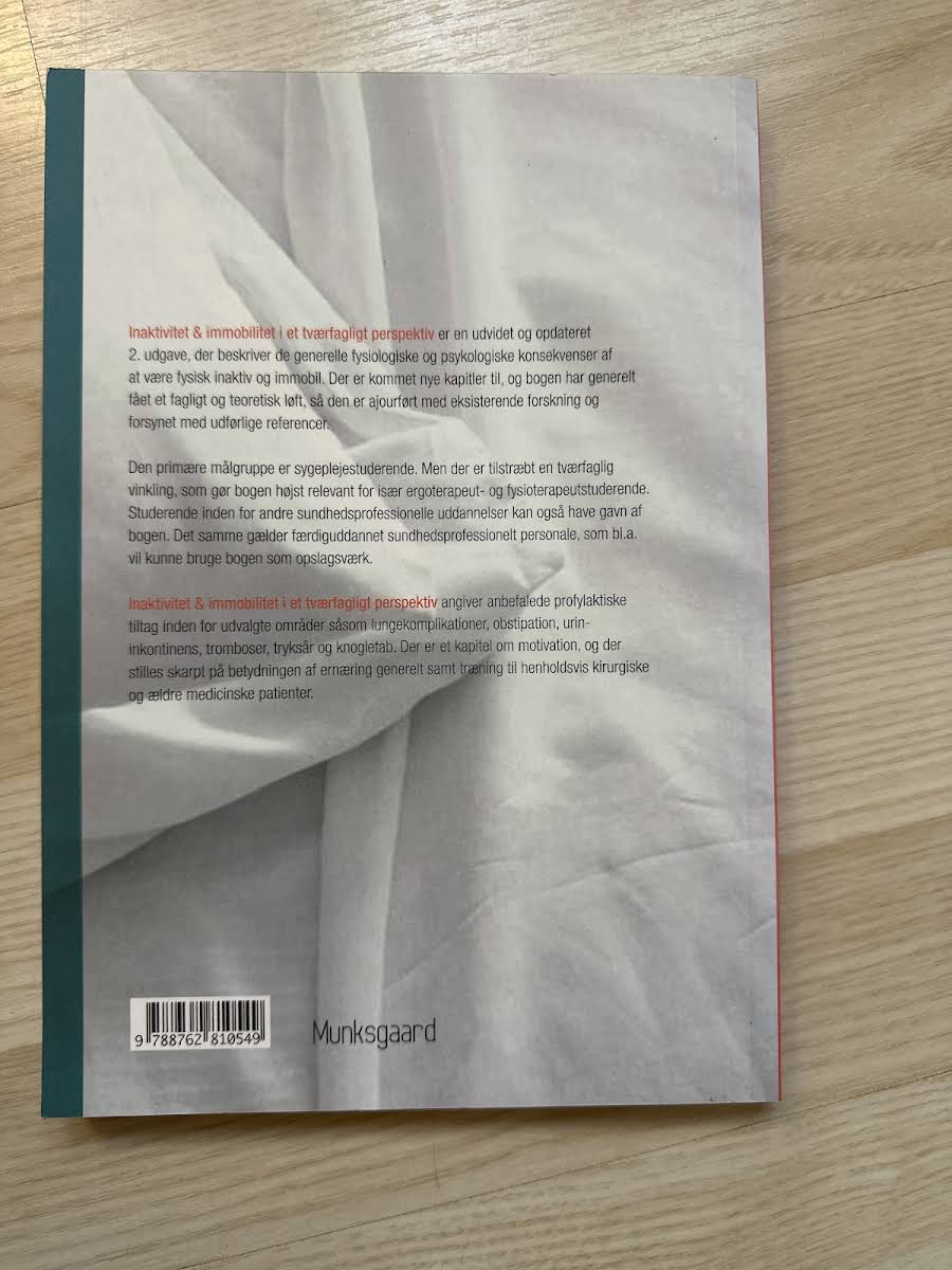 In "Inaktivitet og immobilitet i tværfagligt perspektiv" undersøges de fysiologiske og psykologiske konsekvenser af fysisk inaktivitet og immobilitet ud fra et alsidigt, tværfagligt perspektiv. Bogen afdækker aktuelle emner som lungekomplikationer, tryksår og knogletab, og giver desuden indblik i forebyggende tiltag, der kan have betydning for både kirurgiske og ældre medicinske patienter. Med sin opdaterede teoretiske tilgang og omfattende referencer er bogen ajourført med den nyeste forskning på området. Med udgangspunkt i en målgruppe, der primært omfatter sygeplejestuderende, er bogen struktureret, så den også henvender sig til faggrupper som ergoterapeuter og fysioterapi-studerende. Derudover kan både studerende og allerede uddannede sundhedsprofessionelle drage fordel af den tværfaglige vinkel, der sætter fokus på motivasjon samt ernæringens og træningens betydning i forbindelse med inaktivitet og immobilitet. Gyldendal udgiver denne 230-siders paperback fra 2010, der udgør et værdifuldt opslagsværk inden for sit felt.