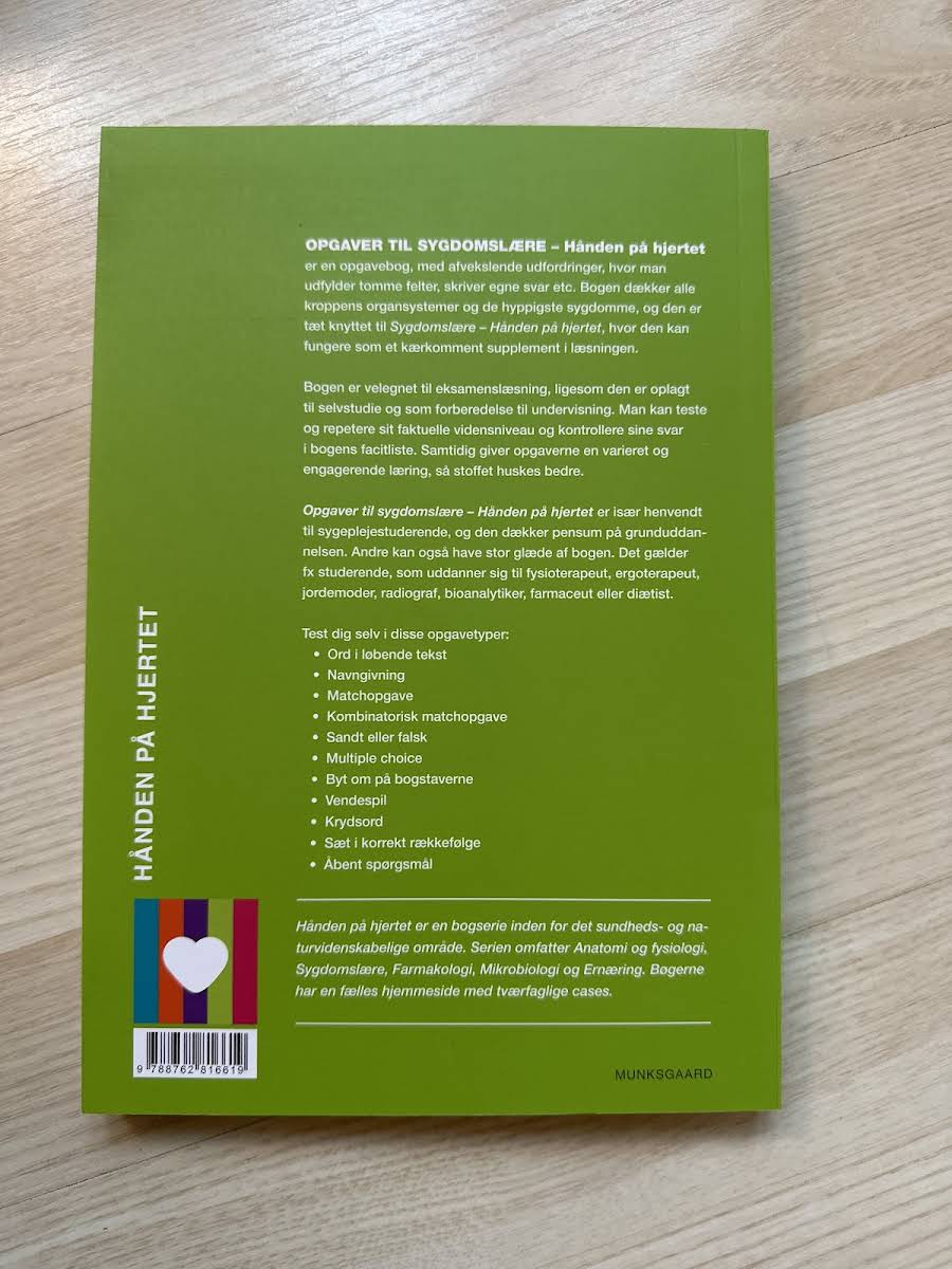 Opgaver til sygdomslære – hånden på hjertet er en alsidig opgavebog, der byder på en række udfordrende og lærerige opgaver, designet til at styrke fagkundskaben inden for sygdomslære. Med opgaver, der spænder fra udfyldningsøvelser til komplekse multiple choice-spørgsmål, kan den studerende både repetere og udbygge sit faktuelle vidensniveau. Bogen er nøje sammensat som et supplement til lærebogen Sygdomslære – hånden på hjertet og er ideel til eksamensforberedelse, selvstudie eller undervisningsforløb. Indholdet dækker nøje alle kroppens organsystemer samt de mest udbredte sygdomme, hvilket gør den særligt relevant for sygeplejestuderende. Samtidig er bogen velegnet for studerende inden for fysioterapi, ergoterapi, jordemoder, radiografi, bioanalytik, farmaci og diætetik. Med udgivelse hos Munksgaard i 2016 og et sideantal på 272, byder denne opgavebog på et alsidigt og struktureret læringsmateriale, der gør det lettere at opnå overblik og fastholde stoffet. Opgaverne stimulerer både refleksion og praktisk anvendelse og sikrer, at den studerende er godt rustet til at håndtere faget på en engagerende og dynamisk måde.