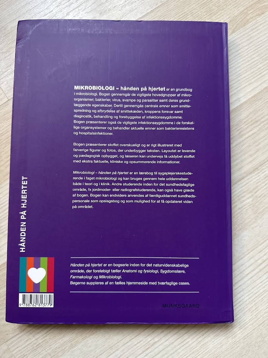 Mikrobiologi – hånden på hjertet er en grundbog i mikrobiologi, der giver et klart overblik over de forskellige mikroorganismer som bakterier, virus, svampe og parasitter samt deres egenskaber. Bogen dykker endvidere ned i, hvordan smitninger opstår og kan brydes, hvordan kroppens forsvar fungerer, samt diagnostik, behandling og forebyggelse af infektionssygdomme. Med et levende layout og rige farverige illustrationer bliver stoffet gjort tilgængeligt og overskueligt. Bogen supplerer den traditionelle tekst med ekstra kliniske og faktuelle indspark samt opsummerende informationer, der giver læseren mulighed for en dybere forståelse af emnerne. Den digitale version indeholder desuden opgaver, animationer, quizzer og en notesbog, der bidrager til en varieret tilgang til læring. Mikrobiologi – hånden på hjertet retter sig primært mod sygeplejerskestuderende, men er også ideel for andre studerende inden for sundhedsfaglige områder samt for færdiguddannet sundhedspersonale, der ønsker at opdatere deres viden. Denne titel fra 2014, udgivet af Gyldendal, står som et uundværligt redskab i studiet af mikrobiologi med et pedagogisk touch, der både fastholder og udfordrer læseren.