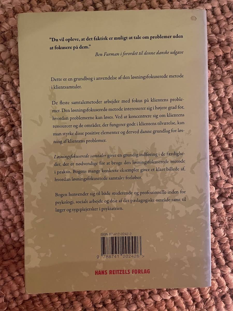 "Løsningsfokuserede samtaler" er en grundbog, der introducerer dig til en samtalemetode, hvor fokus ligger på klientens ressourcer og ikke på problemerne. I stedet for at dvæle ved det, der ikke fungerer, vægter metoden muligheden for at identificere og forstærke de områder i klientens liv, der allerede fungerer godt. Med en praktisk tilgang viser Insoo Kim Berg og Peter de Jong, hvordan en løsningsfokuseret samtale kan skabe en konstruktiv og samarbejdsorienteret ramme, hvor klienten aktivt inddrages i at finde veje til forandring. Bogen rummer lange, illustrative dialoger fra klientsamtaler, som tydeligt skildrer, hvordan den løsningsfokuserede metode anvendes i praksis. Den giver læseren et solidt grundlag i de nødvendige færdigheder og teknikker, som er til gavn for professionelle som psykologer, familiebehandlere, psykiatriske læger, sygeplejersker og andre behandlere i socialt arbejde. Publikation fra Hans Reitzels Forlag fra 2006 og bogens sammenhængende opbygning gør den til et uundværligt redskab for alle, der ønsker at arbejde målrettet med klienters ressourcer og muligheder.