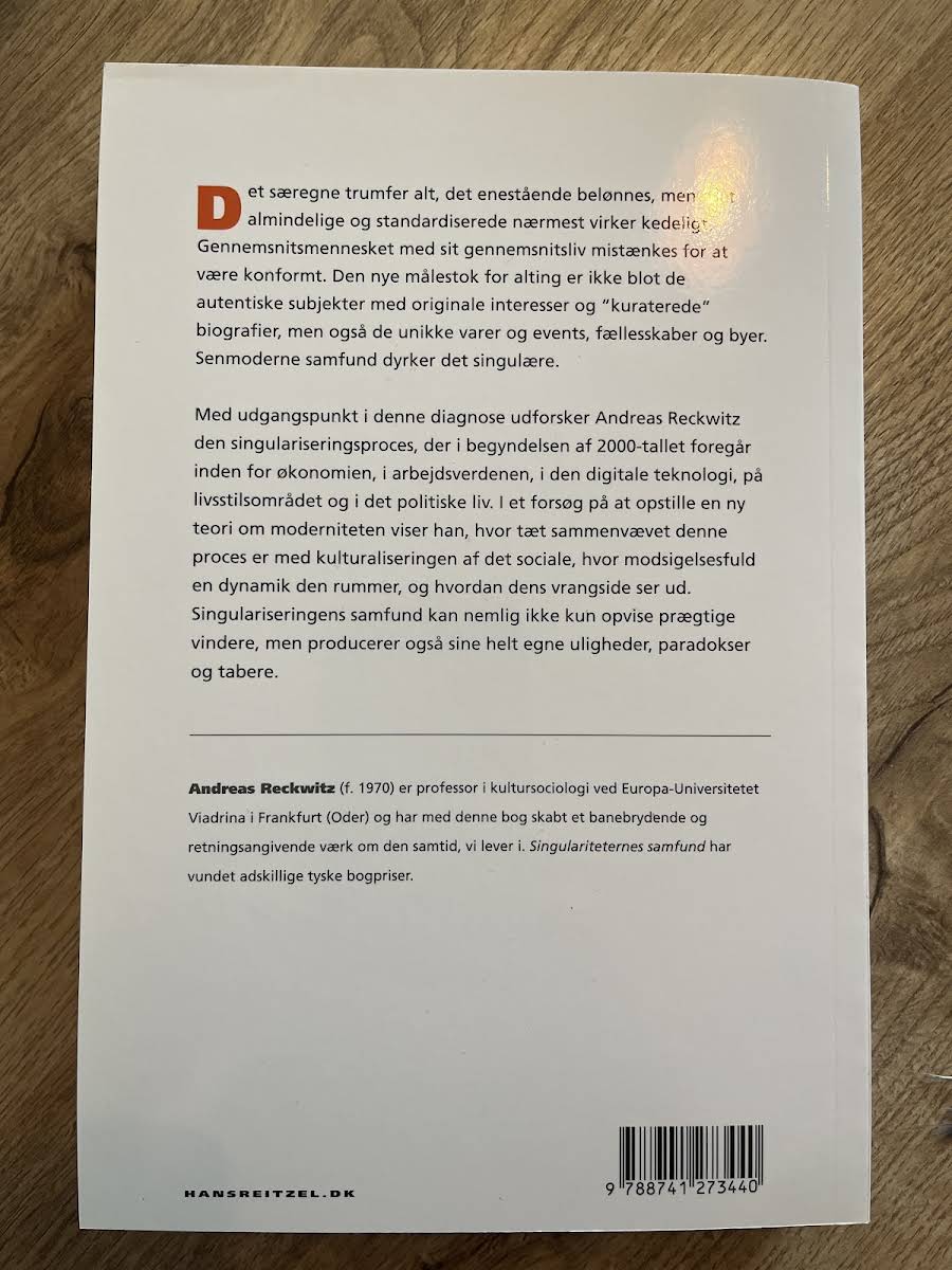 I "Singulariteternes samfund – om modernitetens strukturændringer" tilbyder professor Andreas Reckwitz en skarp analyse af det senmoderne samfunds tilsyneladende modsætningsfyldte dynamikker, hvor det unikke og ekstraordinære sættes i højsædet. Det almindelige og standardiserede opfattes som noget trivielt, mens det autentiske, nyskabende og singulariserede hyldes – et fænomen, der prægger det moderne liv. Med udgangspunkt i de tidlige tegn fra 2000-tallet undersøger Reckwitz, hvordan singulariseringsprocessen breder sig gennem økonomien, politikken, teknologien og de sociale fællesskaber. Bogen belyser, hvordan den nye æstetik, hvor det usædvanlige jubeludbringes, samtidig producerer uligheder, paradokser og nye former for tabere. Gennem en dybdegående og nuanceret teoretisk tilgang giver Andreas Reckwitz et væsentligt bidrag til forståelsen af de strukturændringer, som præger vores samtid. Denne første udgave fra 2019 er en grundig undersøgelse af modernitetens kompleksitet og de samfundsmæssige skift, der følger med den.