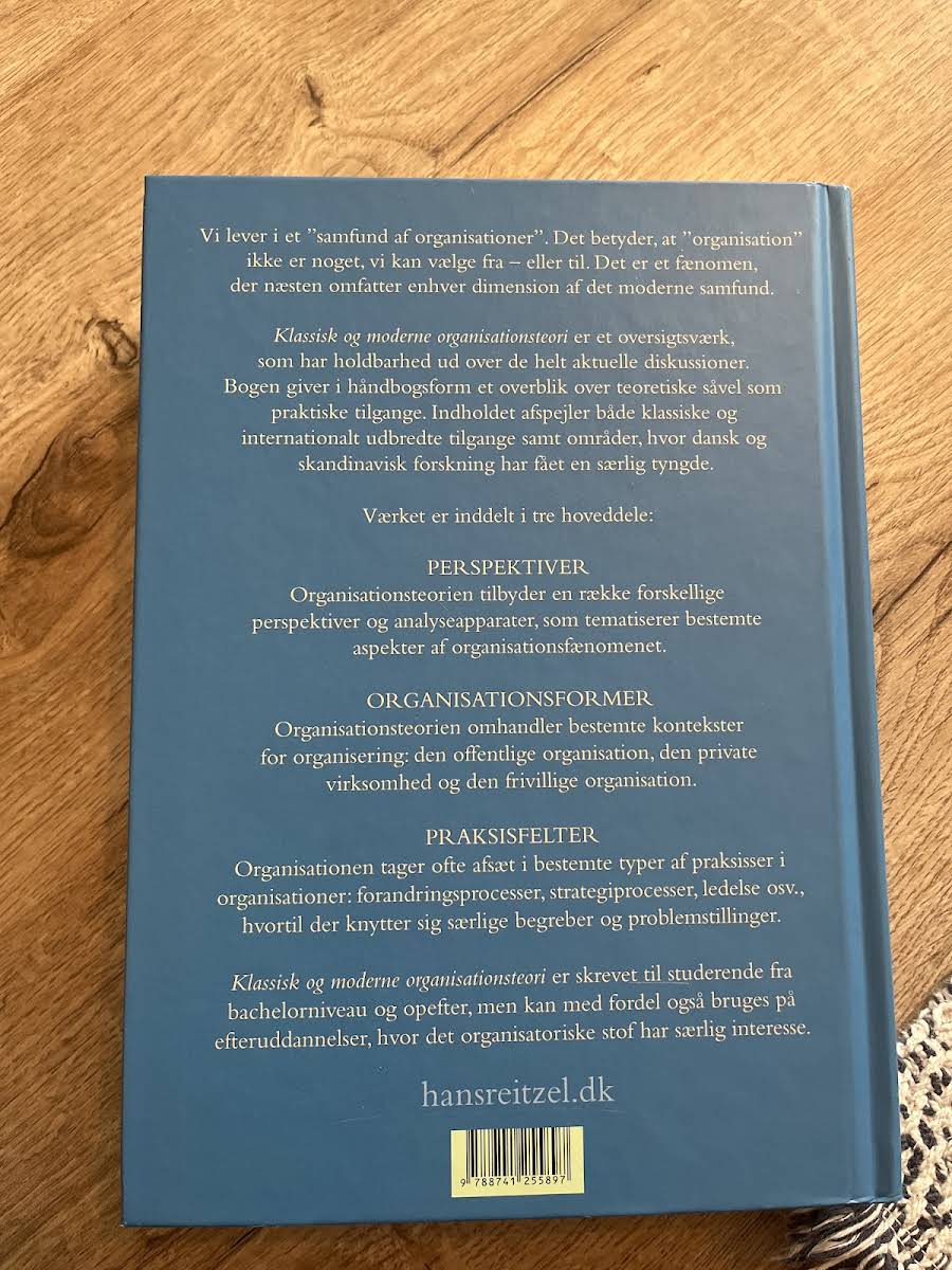 "Klassisk og moderne organisationsteori" er et omfattende værk, der giver et indsigtsfuldt overblik over de teoretiske og praktiske delfelter inden for organisationsteori. Bogen præsenterer både klassiske teorier og internationalt anerkendte perspektiver, hvilket gør den velegnet som et opslagsværk, hvor man nemt kan sætte de forskellige teorier op imod hinanden. Med en håndbogsagtig tilgang er indholdet struktureret, så det både tilgodeser den studerende på bachelorniveau og den, der søger efteruddannelse inden for feltet. Bogen lægger vægt på at kombinere tidløse teoretiske fundamenter med moderne diskussioner, der afspejler de aktuelle strømninger i forskningen. Læsere tilbydes et redskab, hvor de kan navigere i og reflektere over de mange aspekter af organisationsteorien – fra de traditionelle til de mere nutidige perspektiver, der også indbefatter danske og skandinaviske bidrag.