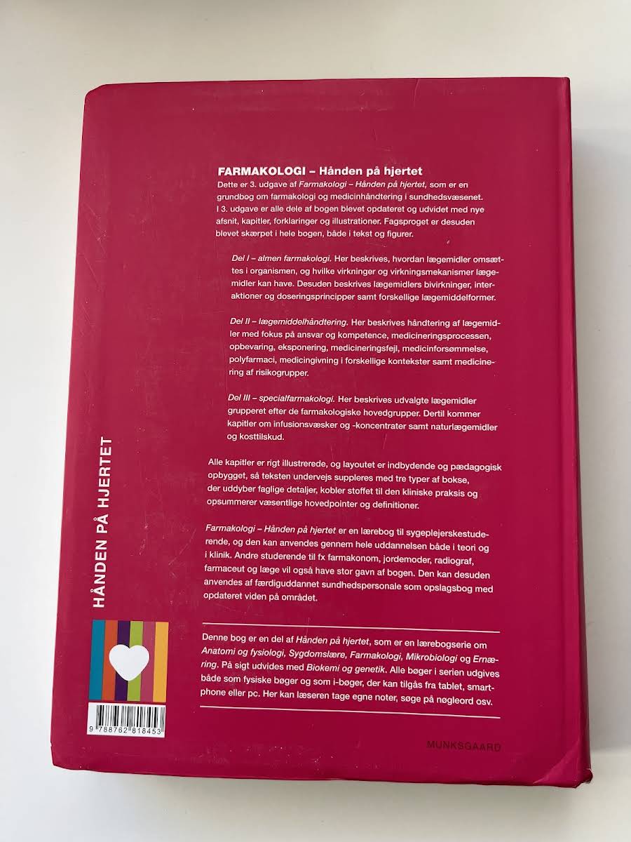 3. udgave af Farmakologi – Hånden på hjertet præsenterer en omfattende og ajourført introduktion til farmakologi og korrekt håndtering af lægemidler. Med 714 sider byder bogen på nye afsnit, kapitler og illustrationer, der hver især understøtter fagsproget og den kliniske relevans. Bogen er inddelt i tre hoveddele, hvor Del I omhandler almen farmakologi med fokus på lægemidlers optagelse, omsætning og virkningsmekanismer i kroppen. Del II fokuserer på modern medicinhåndtering, med vægt på ansvarsområder, doseringsprincipper og forebyggelse af medicineringsfejl i sundhedsvæsenet. Del III dykker ned i specialfarmakologi og giver et detaljeret indblik i de forskellige lægemiddelgruppers særlige egenskaber, herunder praktiske betragtninger om infusionsvæsker, naturlægemidler og kosttilskud. Den pædagogiske opbygning med fokuserede bokse, der fremhæver nøgleinformation og kliniske perspektiver, gør bogen særlig velegnet både til studerende og fagfolk.
