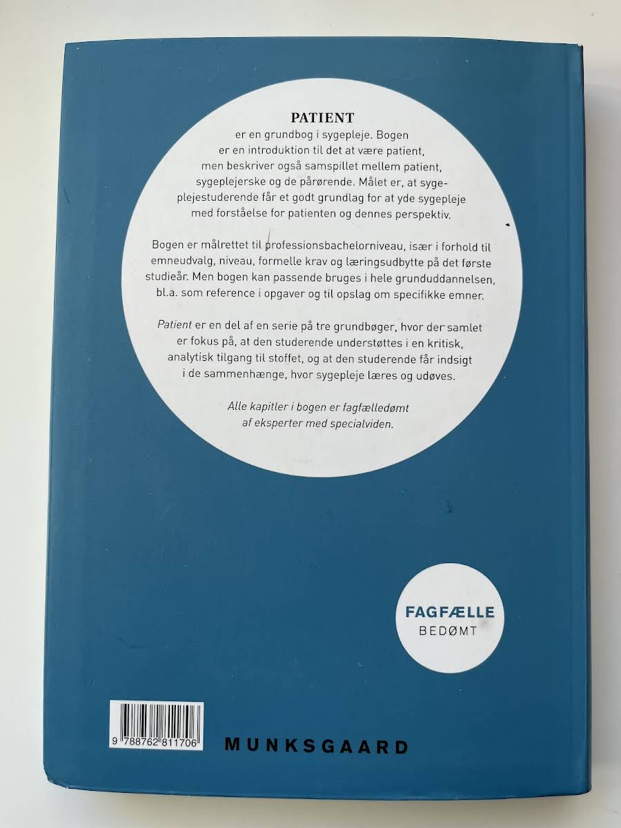 Patient er en grundbog, der giver et indgående indblik i patientrollen og det komplekse samspil mellem patient, sygeplejerske og pårørende. Bogen skaber et solidt udgangspunkt for at forstå de menneskelige aspekter i sygeplejens praksis og understøtter udviklingen af en empatisk og reflekteret tilgang til faget. Bogen henvender sig primært til professionsbachelorstuderende i deres første år, hvor den hjælper med at opbygge den nødvendige teoretiske ballast og de analytiske færdigheder, der er essentielle i sygeplejen. Samtidig fungerer den som en værdifuld reference gennem hele uddannelsen. Patient er en del af en serie på tre grundbøger, der tilsammen fremmer en kritisk tilgang til sygeplejefaget og belyser de mange facetter, der spiller ind, når sygepleje læres og udøves. Hvert kapitel er fagfælledømt af eksperter, hvilket sikrer en høj faglig kvalitet og relevans for studerende. Bogen indeholder desuden en individuel e-nøgle, som åbner op for adgang til en i-bogsversion med videoer, quizzer og andet ekstramateriale – et redskab, der yderligere understøtter læringsprocessen og den faglige fordybelse.