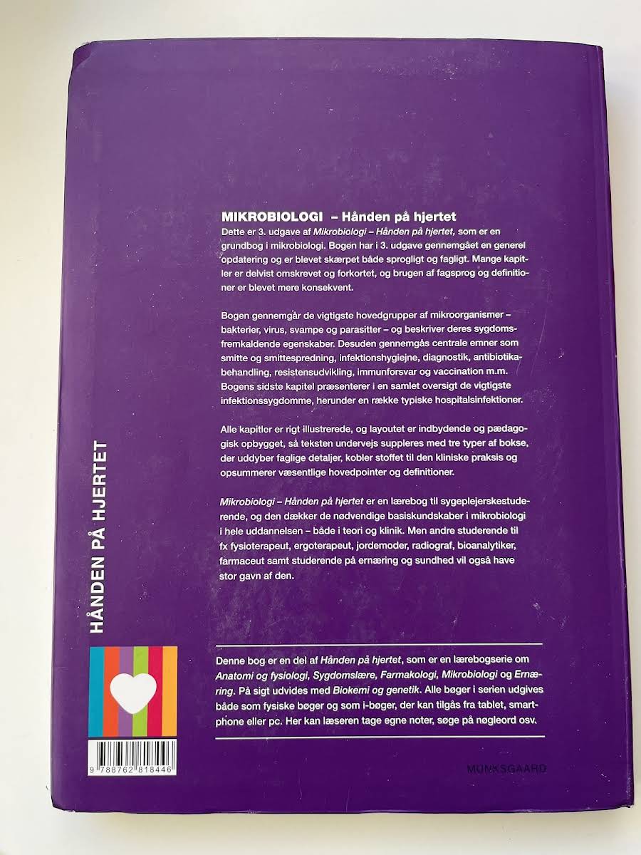 I 3. udgave af Mikrobiologi – Hånden på hjertet er grundbogen i mikrobiologi blevet gennemgået med en omfattende faglig og sproglig opdatering. Mange kapitler er revideret, forkortet og tilpasset med et mere konsekvent fagsprog, så læseren oplever en strømlinet og moderne tilgang til stoffet. Bogen dykker ned i de væsentligste mikroorganismer – herunder bakterier, virus, svampe og parasitter – og belyser deres rolle i sygdomsprocesser. Centrale temaer som smitte, infektionshygiejne, diagnostik, antibiotikabehandling, resistensudvikling, immunforsvar og vaccination behandles grundigt og præcist. Med et indbydende layout, rige illustrationer og specialdesignede bokse, der både forklarer faglige detaljer, relaterer stoffet til klinisk praksis og fremhæver hovedpointer, bliver bogen en uvurderlig ressource. Den er skræddersyet til sygeplejerskestuderende, men er også relevant for studerende inden for fysioterapi, ergoterapi, jordemoder, radiografi, bioanalytik, farmaci samt ernæring og sundhed.