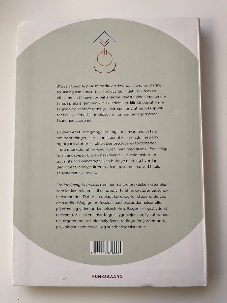 "Fra forskning til praksis" giver et solidt indblik i, hvordan sundhedsfaglig forskning kan omsættes til praksis til gavn for patienterne. Bogen fokuserer på at bringe den nyeste viden ind i klinisk lederskab, beslutningsprocesser og udvikling af kliniske retningslinjer. Gennem en systematisk tilgang fremhæves, hvordan forskellige forskningstyper bidrager med evidens, der understøtter både kliniske og organisatoriske beslutninger. Med en række praktiske eksempler, er bogen et relevant redskab for alle sundhedsprofessionelle. Den henvender sig til studerende på professionsbacheloruddannelser samt til erfarne praktikere som læger, sygeplejersker, fysioterapeuter, ergoterapeuter, bioanalytikere, radiografer, jordemødre, psykologer og social- og sundhedsassistenter. Publikationen rummer en blanding af teori og praksis, som understøtter implementeringen af ny viden i det daglige arbejde med at optimere patientpleje.