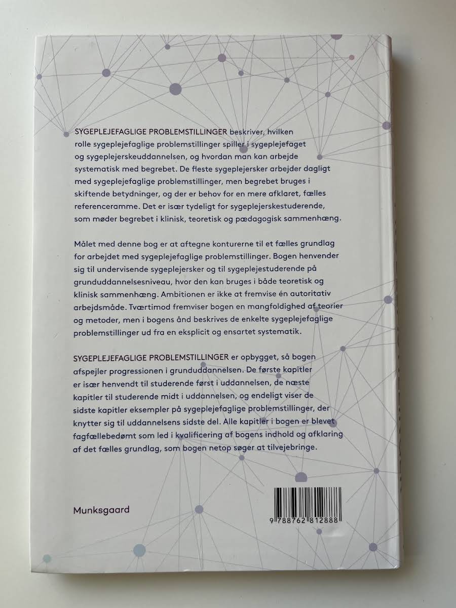 Sygeplejefaglige problemstillinger giver en grundig introduktion til, hvordan udfordringer inden for sygeplejefaget kan identificeres og bearbejdes systematisk. Bogen belyser, hvordan begrebet – der ofte anvendes med varierende definitioner i både klinisk, teoretisk og pædagogisk praksis – kan forenes gennem en fælles referenceramme til gavn for både studerende og undervisende sygeplejersker. Målet med værket er at skabe overblik over de mange sider af sygeplejefaglige problemstillinger, uden at påtvinge én fast arbejdsmåde. I stedet præsenteres et bredt spektrum af teorier og metoder, der alle behandles ud fra en klar og ensartet systematik. Det gør bogen særligt velegnet til anvendelse i både teoretiske og kliniske undervisningssammenhænge på grunduddannelsesniveau. Bogens opbygning spejler progressionen i sygeplejerskeuddannelsen: De indledende kapitler retter sig mod de studerende, som er i starten af deres uddannelse, mens de efterfølgende afsnit henvender sig til dem midt i forløbet. Afsluttende kapitler præsenterer konkrete eksempler, der er relevante for den afsluttende del af uddannelsen. Alle kapitler er fagfællebedømte, hvilket understreger bogens kvalitet og den fælles tilgang, som den bidrager til at etablere.