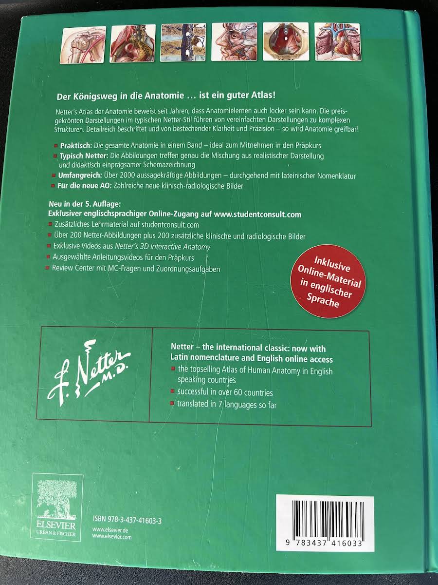 Atlas der Anatomie, af den anerkendte anatomiske illustrator Frank Netter, er et førende referenceværk inden for anatomi med latinsk nomenklatur. Denne 5. udgave fra 2011 indeholder 616 sider fyldt med detaljerede og illustrative gengivelser af menneskets anatomi. Det tysksprogede atlas suppleres med et engelsk indeks, hvilket gør det tilgængeligt for et internationalt publikum. Ud over de etablerede illustrationer omfatter denne udgave også online materiale, som giver brugeren adgang til videomateriale på Netter's 3D Interactive Anatomy. Desuden medfølger et multiple-choice test-center, der understøtter både studerende og fagfolk i en grundig forståelse af anatomien. Atlas der Anatomie er et uundværligt redskab for alle, der arbejder med og studerer anatomi.