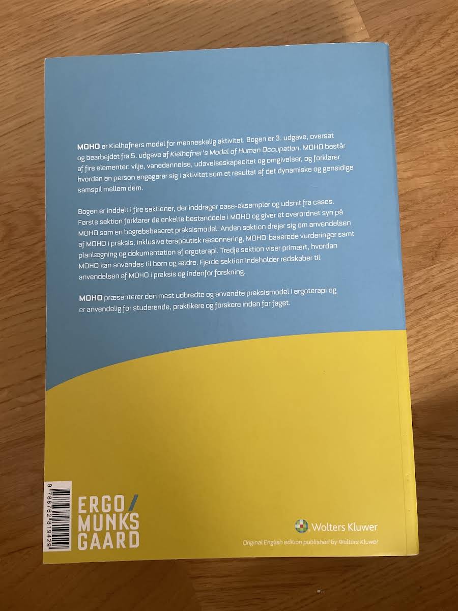 MOHO er Kielhofners model for menneskelig aktivitet, struktureret omkring de fire nøgleelementer: vilje, vanedannelse, udøvelseskapacitet og omgivelser. Denne 3. udgave, oversat og bearbejdet fra den 5. udgave af Kielhofner's Model of Human Occupation, giver et solidt teoretisk udgangspunkt for forståelsen af, hvordan mennesker engagerer sig i aktiviteter gennem et komplekst samspil mellem de nævnte elementer. Bogen er inddelt i fire afsnit, der kombinerer teori med praktiske eksempler og cases. Det første afsnit redegør for de enkelte bestanddele og det overordnede koncept, mens det andet afsnit fokuserer på den praktiske anvendelse i form af terapeutisk ræsonnering, MOHO-baserede vurderinger samt planlægning og dokumentation af ergoterapi. Tredje afsnit belyser modellens anvendelse hos både børn og ældre, mens det fjerde afsnit rummer redskaber, der understøtter både klinisk praksis og forskning. Denne bog er et uvurderligt redskab for studerende, praktikere og forskere inden for ergoterapi.
