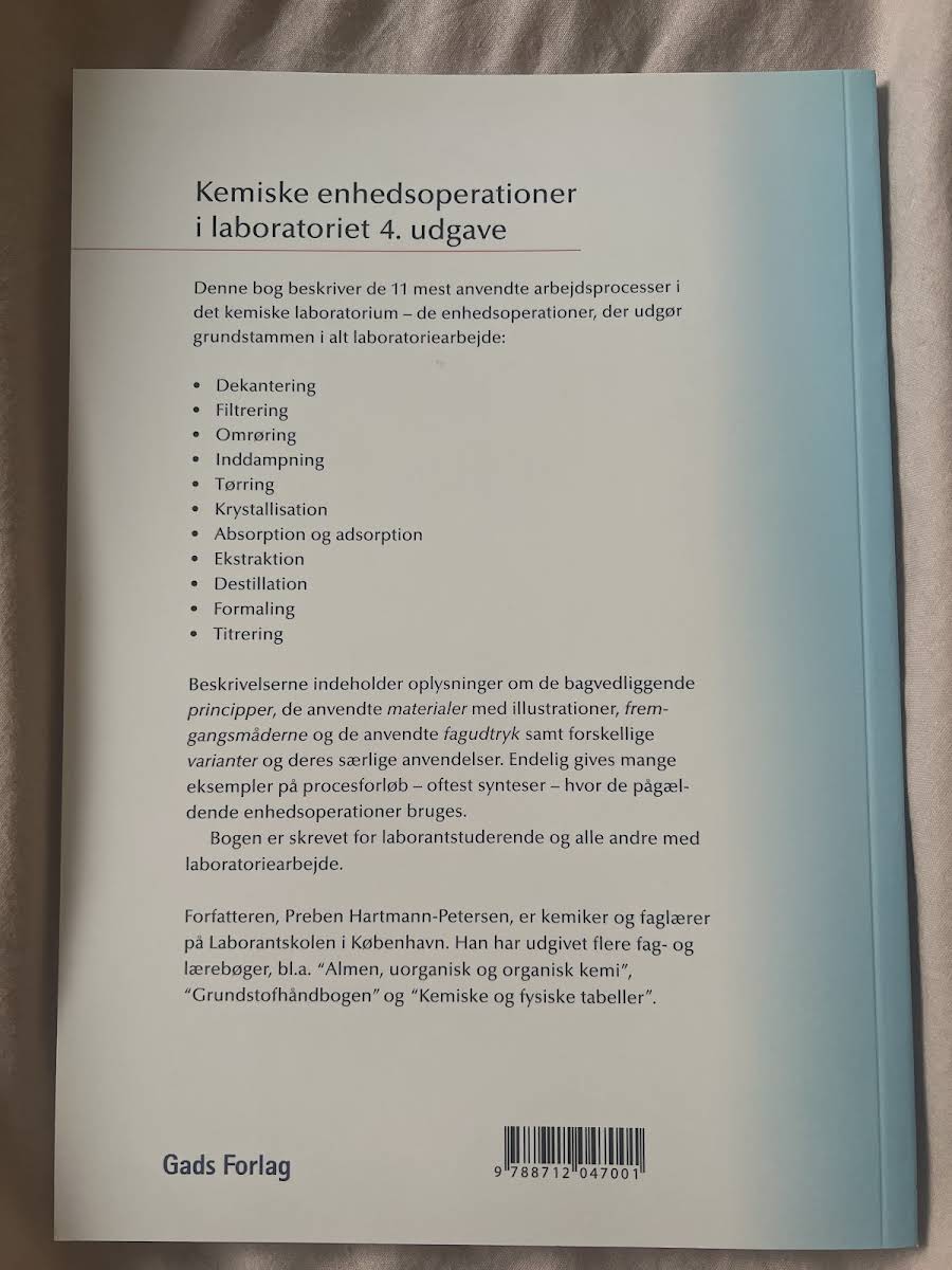 Kemiske enhedsoperationer i laboratoriet er en faglæringsbog, der henvender sig til undervisningen på bioanalytiker- og laborantuddannelser samt i gymnasier, og den er samtidig et oplagt redskab for alle, der arbejder i laboratoriemiljøer. Bogen præsenterer en række centrale enhedsoperationer, som danner fundamentet for laboratoriearbejde, og giver en grundig indføring i de grundlæggende processer. Bogen dækker blandt andet de essentielle operationer såsom dekantering, filtrering, omrøring, inddampning, tørring, krystallisation, absorption og adsorption, ekstraktion, destillation, formaling og titrering. Hvert emne bliver nøje belyst med bagvedliggende principper, detaljerede beskrivelser af de anvendte materialer og illustrerede fremgangsmåder. Der gives desuden en række eksempler på procesforløb, der understreger, hvordan disse enhedsoperationer praktisk anvendes i synteser og andre laboratorieprocesser. Preben Hartmann-Petersen leverer med denne bog et solidt fundament for forståelsen af laboratorieprocedurer, hvilket gør den til et uundværligt værktøj for både studerende og praktiserende laboratorieteknikere. Publikationen fra 2011 udbyder en strømlinet og overskuelig tilgang til de nøgleprocesser, der præger det kemiske arbejde i laboratoriet.
