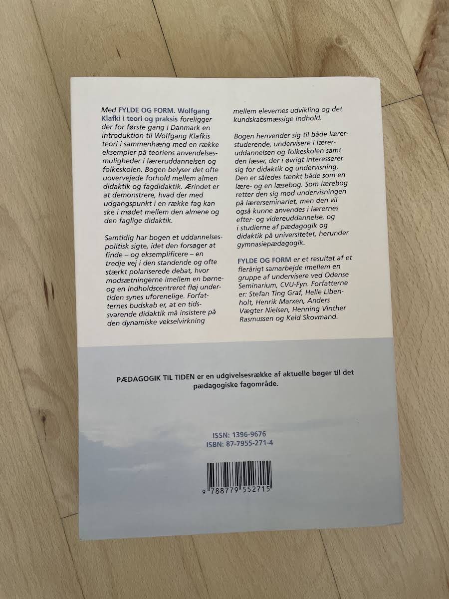 Fylde og form byder læseren velkommen til en dybdegående introduktion til Wolfgang Klafkis didaktiske teori, der for første gang bringes i spil i Danmark. Bogen demonstrerer, hvordan Klafkis tanker kan omsættes i praksis med eksempler fra læreruddannelsen og folkeskolens virkelighed, og viser potentielle krydsfelter mellem almen didaktik og fagdidaktik. Med et klart uddannelsespolitisk sigte udforsker forfatterne, hvordan en harmonisk forening af elevudvikling og det faglige indhold kan være med til at bane vejen for en tredje vej i den ofte polariserede debat mellem børne- og indholdscentrerede tilgange. Denne første udgave af Fylde og form vækker refleksion og inspiration hos både undervisere og studerende, og understreger nødvendigheden af en dynamisk vekselvirkning mellem de pædagogiske metoder.