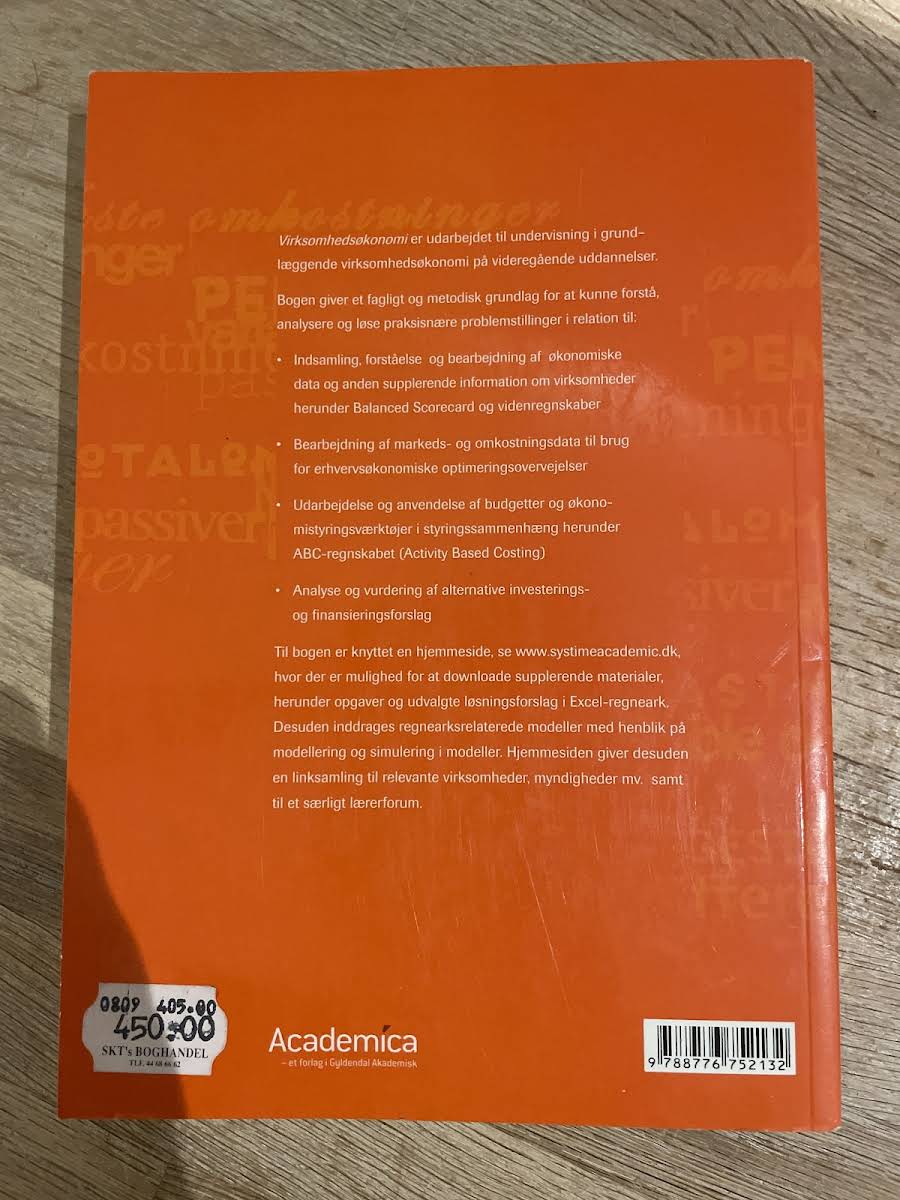 Virksomhedsøkonomi – til videregående uddannelser giver en solid teoretisk og metodisk introduktion til de centrale begreber inden for virksomhedsøkonomi. Bogen opbygger et fundament, der gør det muligt at indsamle, forstå og bearbejde økonomiske data samt anden supplerende information om virksomheder, herunder elementer som Balanced Scorecard og vidensregnskaber. Med sin systematiske tilgang præsenterer bogen, hvordan markeds- og omkostningsdata kan anvendes i analyser og optimeringsovervejelser. Endvidere introduceres læseren for udarbejdelse og anvendelse af budgetter og økonomistyringsværktøjer, herunder ABC-regnskabet (Activity Based Costing), samt evaluering af alternative investerings- og finansieringsmodeller.