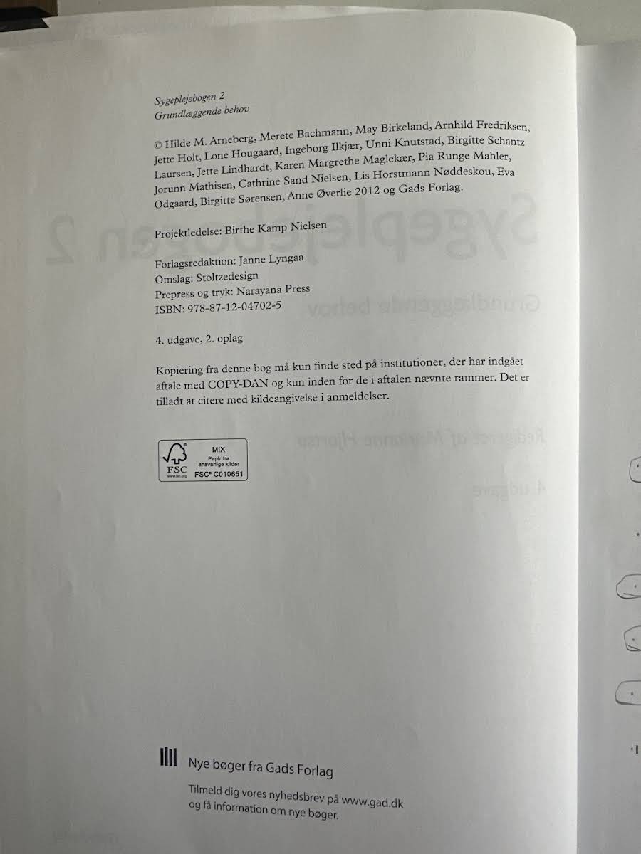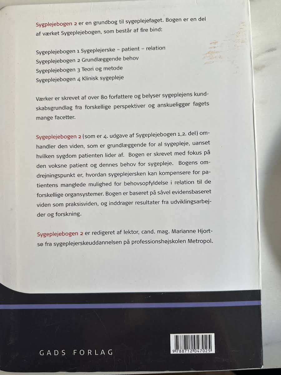 Sygeplejebogen 2 – Grundlæggende behov udgives nu i sin 4. udgave og er et redskab, der med fokus på de grundlæggende behov i sygeplejen understøtter de studerendes evne til at observere, reflektere og handle på kliniske udfordringer. Bogen er struktureret i overskuelige kapitler, der hver især bidrager til at styrke den studerendes faglige forståelse og observationskompetence. Indholdet er nøje tilpasset de læringsudbytter, som Studieordningen 2008 fastsætter for de første moduler på sygeplejerskeuddannelsen. Under redaktionen af Marianne Hjortsø kombineres erfaring fra klinisk praksis, pædagogik og forskning for at give læseren et solidt fundament i de sygeplejefaglige problemstillinger. Med en velkendt og genkendelig kapitelopbygning byder Sygeplejebogen 2 på et redskab, der på en overskuelig måde guider den studerende gennem de centrale emner i sygeplejefaget og understøtter den faglige og kliniske udvikling.
