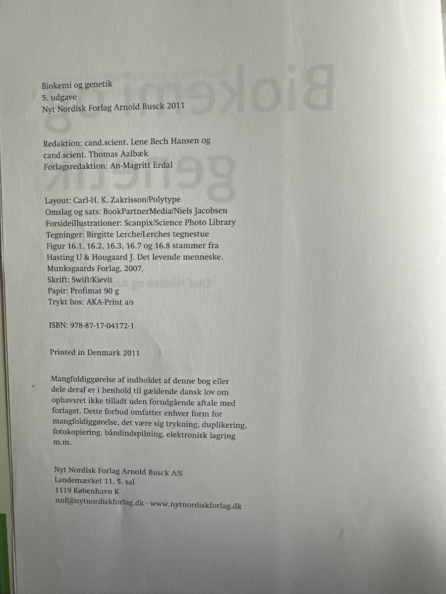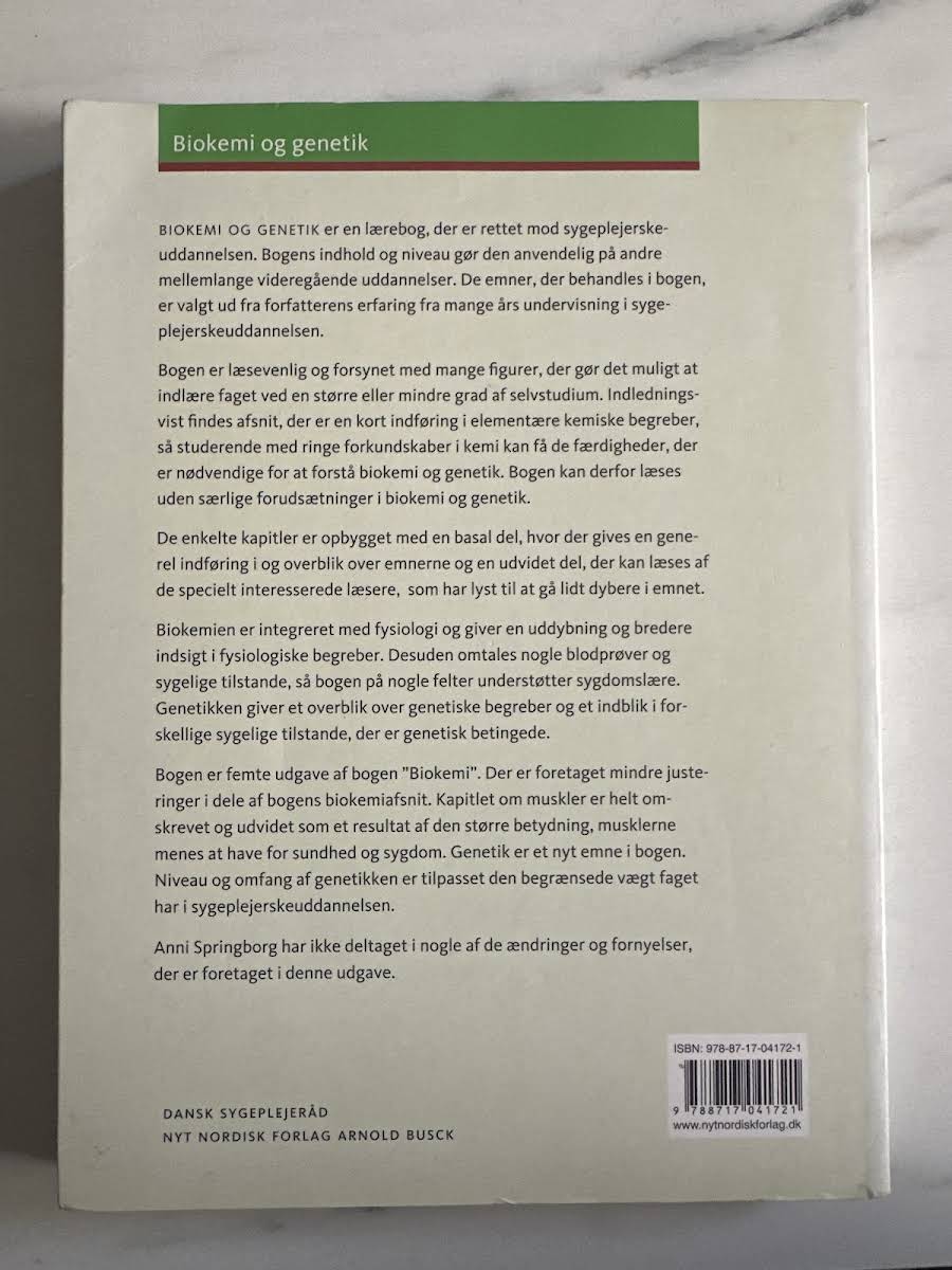 Biokemi og genetik er en alsidig lærebog designet til studerende på sygeplejerskeuddannelsen og andre sundhedsrelaterede studieretninger. Bogen bygger på mange års erfaring med at formidle komplekse fagområder på en tilgængelig måde, hvor både basale og avancerede emner bliver præsenteret med klarhed og overskuelighed. Indledende kapitler giver en kort og præcis introduktion til grundlæggende kemiske principper, så studerende uden omfattende forkundskaber i kemi får de nødvendige redskaber til at forstå de videregående emner. Hvert kapitel er struktureret med en grundlæggende del for at skabe et overblik, efterfulgt af en udvidet sektion for dem, der ønsker at dykke dybere ned i stoffet. Bogens integrerede tilgang til biokemi og fysiologi bidrager til en bredere forståelse af kroppens processer samt de underliggende mekanismer bag sygdomme. Endvidere giver indslaget i genetik et solidt overblik over genetiske principper og de arvelige sygdomstilstande, der er relevante for sundhedssektoren. I denne femte udgave er seneste justeringer og en nyligt tilføjet sektion om genetik med til at skærpe fokus på de emner, der har fået øget betydning i relation til moderne sygepleje og sygdomslære.
