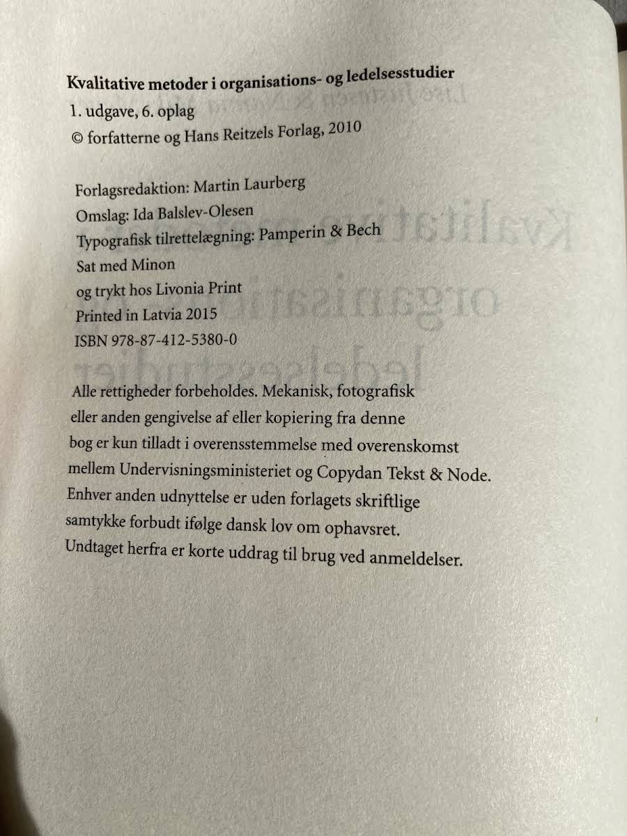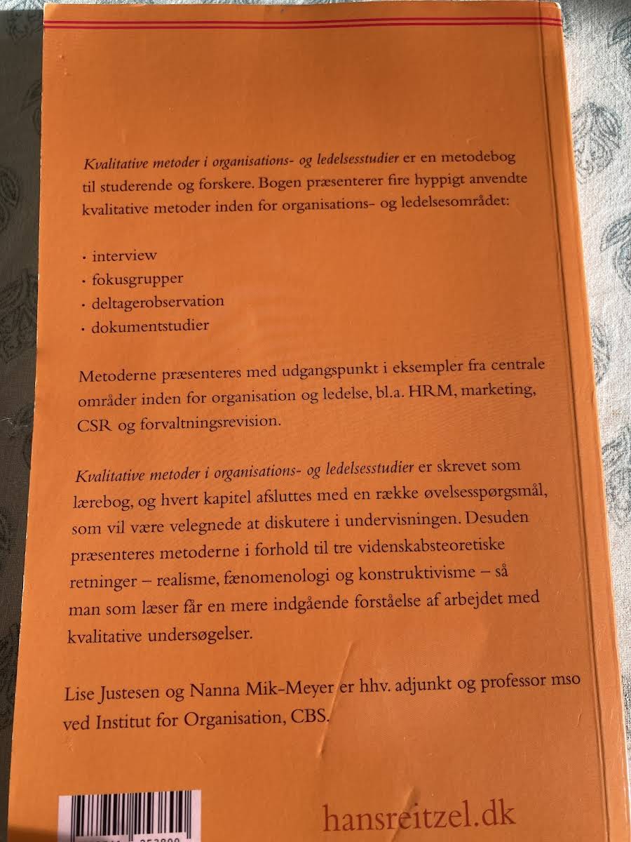Kvalitative metoder i organisations- og ledelsesstudier er en metodebog for både studerende og forskere, som præsenterer de fire mest anvendte kvalitative metoder inden for organisation og ledelse: interview, fokusgrupper, deltagerobservation og dokumentstudier. Bogen illustrerer metoderne med praktiske eksempler fra centrale områder såsom HRM, marketing, CSR og forvaltningsrevision – og giver dermed et godt udgangspunkt for at forstå, hvordan kvalitative metoder kan anvendes i praksis. Bogen er opbygget som en lærebog, hvor hvert kapitel afsluttes med øvelsesspørgsmål, der inspirerer til refleksion og diskussion. Desuden belyses metoderne ud fra tre videnskabsteoretiske retninger – realisme, fænomenologi og konstruktivisme – hvilket bidrager til en nuanceret tilgang til kvalitative undersøgelser. Lise Justesen og Nanna Mik-Meyer giver med denne udgivelse et værdifuldt redskab til at navigere i organisations- og ledelsesforskningens verden.