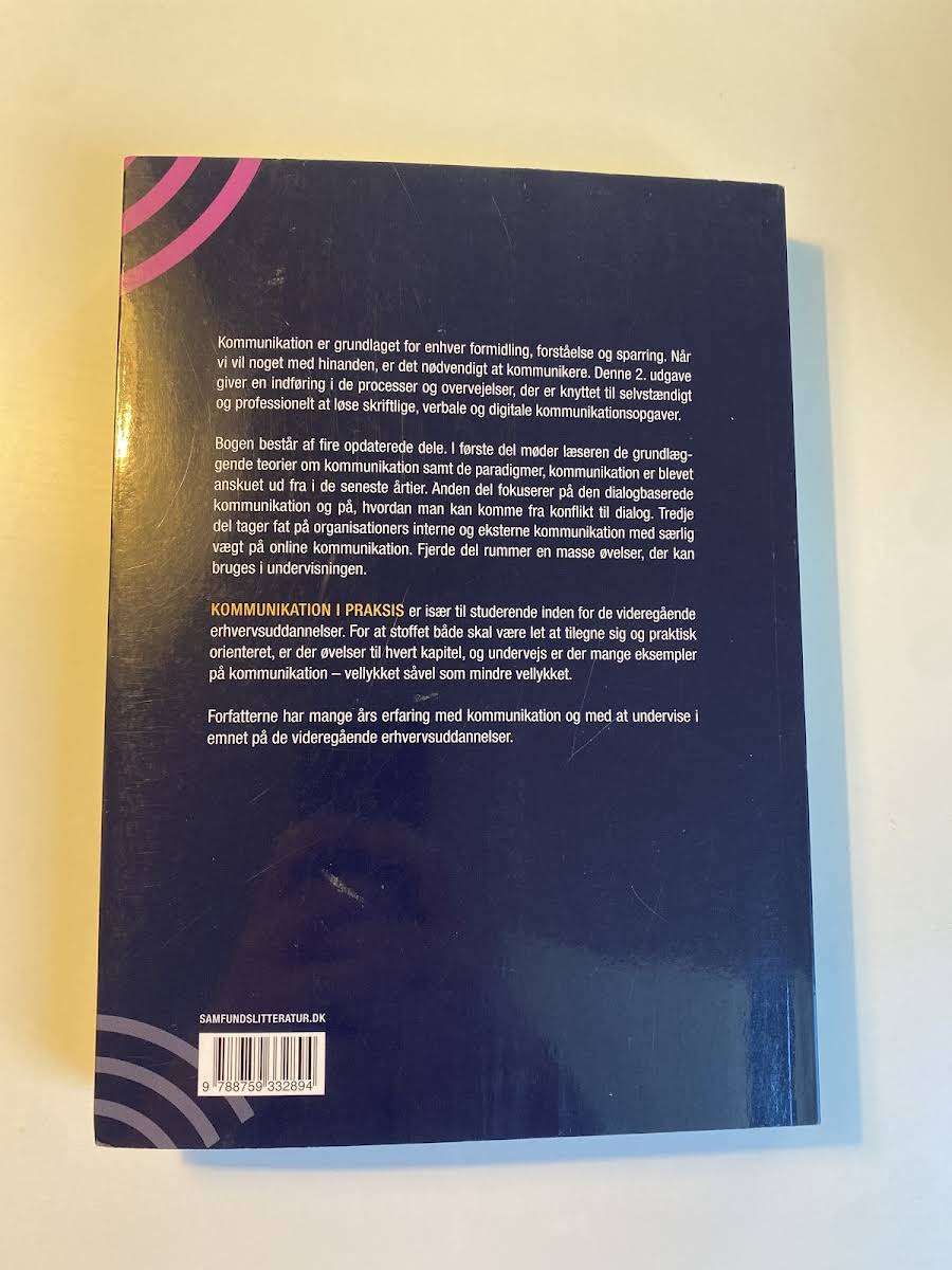 Kommunikation udgør kernen i al formidling, forståelse og interaktion. I denne 2. udgave af Kommunikation i praksis præsenteres de processer og overvejelser, der ligger til grund for en professionel håndtering af skriftlige, verbale og digitale kommunikationsopgaver. Bogen er struktureret i fire opdaterede dele. Den første del introducerer centrale teorier og paradigmer, der har præget kommunikationsfeltet i de seneste årtier. Herefter belyser den anden del den dialogbaserede kommunikation, og hvordan man effektivt bevæger sig fra konflikt til konstruktiv dialog. I tredje del sættes fokus på organisationers interne og eksterne kommunikation med særlig opmærksomhed på digitale platforme. Den fjerde del tilbyder et bredt udvalg af øvelser, som effektivt understøtter den praktiske anvendelse af stoffet i forhold til undervisning og læring. Kommunikation i praksis henvender sig især til studerende på videregående erhvervsuddannelser, og giver et let tilgængeligt og praksisorienteret indblik i kommunikationens mange facetter.