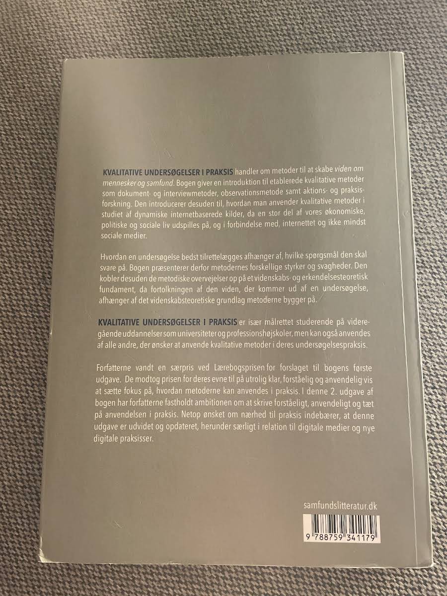 Kvalitative undersøgelser i praksis tilbyder en grundig introduktion til brugen af kvalitative metoder til at opnå indsigt i menneskers adfærd og samfundets dynamikker. Bogen dykker ned i centrale metoder såsom dokument- og interviewmetoder, observationsmetoder samt aktions- og praksisforskning, og giver et solidt overblik over, hvordan disse teknikker kan anvendes til at belyse emner, der spænder fra klassiske feltstudier til nutidens digitale landskaber. Med et særligt fokus på de muligheder, som internetbaserede kilder og sociale medier tilbyder, stiller bogen skarpt på, hvordan komplekse fænomener bedst undersøges ud fra de spørgsmål, man ønsker at besvare. Den grundlæggende diskussion af metodernes styrker og begrænsninger understreges ved et videnskabs- og erkendelsesteoretisk fundament, der hjælper læseren med at forstå, på hvilken måde de teoretiske forudsætninger påvirker fortolkningen af undersøgelsesresultaterne. Rettet mod studerende på videregående uddannelser samt andre praktikere, der søger en anvendelsesorienteret viden om kvalitative metoder, præsenterer denne 2. udgave en opdateret og udvidet version af den første udgave, som blev anerkendt med en særpris for sin evne til klart og anvendeligt at illustrere metodernes praktiske anvendelse.