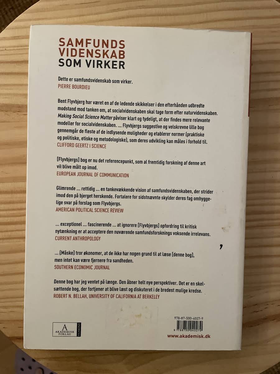 "Samfundsvidenskab som virker" præsenterer en nyskabende tilgang til samfunds- og adfærdsvidenskaberne, hvor Bent Flyvbjerg demonstrerer, at bogens styrke ligger i den komplekse og refleksive analyse af værdier og magt. I stedet for at efterligne naturvidenskabernes stræben efter generaliseret teori, fremhæver Flyvbjerg, hvordan en dybdegående undersøgelse af den menneskelige aktivitet i samfundets virkelighed kan åbne op for ny indsigt og relevans. Bogen byder på klare metodologiske retningslinjer og praktiske eksempler, som giver læserne en solid forståelse af, hvordan samfundsvidenskaben kan forme vores opfattelse af sociale og økonomiske processer. Denne livgivende tilgang gør "Samfundsvidenskab som virker" til pligtlæsning for studerende og forskere, der ønsker at udforske de mange facetter af samfunds- og adfærdsvidenskaberne.