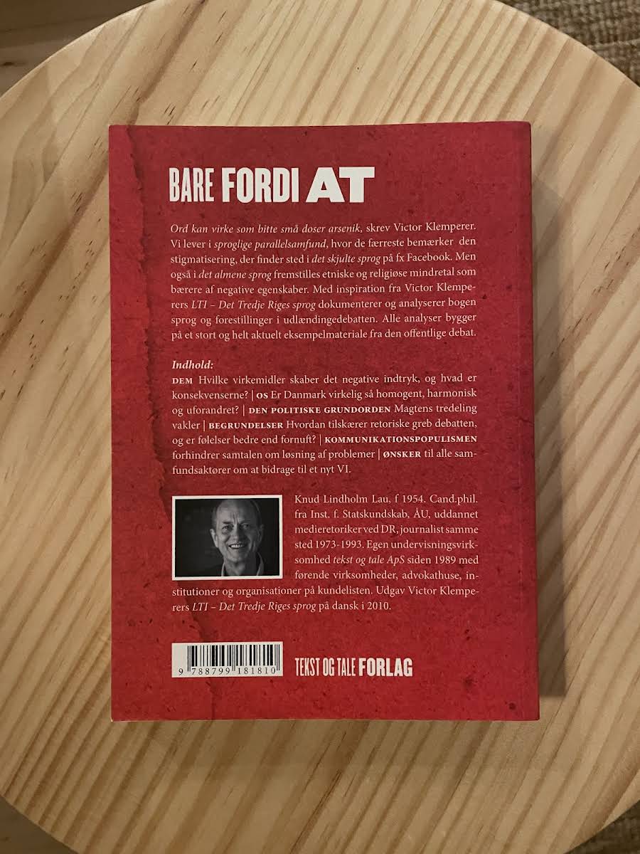 I "Bare fordi at" demonstrerer Knud Lindholm Lau sin skarpe sans for sprogets magt og de ofte usete mekanismer bag vores kommunikation. Med et lettilgængeligt sprog inviterer han både almenheden og den studerende til at reflektere over, hvordan selv små formuleringer kan have stor betydning for den offentlige debat. Bogen, som udkom i 2018 hos Tekst og Tale, er en førsteudgave på 300 sider, der kombinerer dybdegående analyser med et behersket og tankevækkende udtryk. Knud Lindholm Lau udfordrer os til at se nærmere på, hvad der sker, når man ikke altid behøver at have en tilsyneladende logisk begrundelse – for nogle gange, sker tingene "bare fordi at".