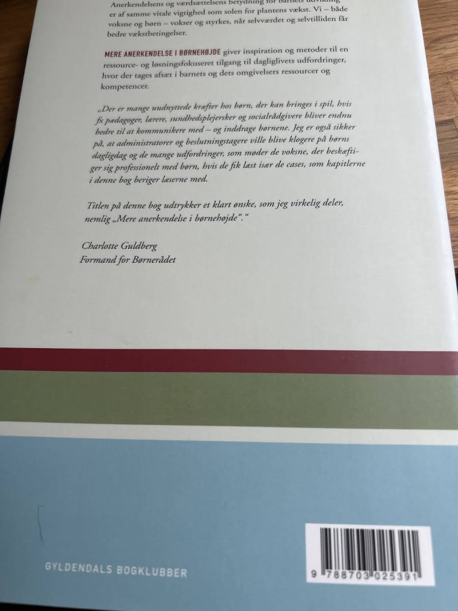 Mere anerkendelse i børnehøjde er en inspirerende bog, der tilbyder læseren en række metoder og tilgange til en ressource- og løsningsfokuseret hverdag. Med udgangspunkt i barnets perspektiv, præsenterer forfatterne Berit Hertz, Frank Iversen og Astrid Fabricius, hvordan man kan anerkende og styrke barnets naturlige ressourcer og kompetencer. Bogen fokuserer på at finde nye veje til at tackle dagliglivets udfordringer, hvor både barnets og omgivelsernes evner og muligheder inddrages. Udgivet i 2007, giver denne paperback et praktisk og virkelighedsnært indblik i, hvordan anerkendelse i børnehøjde kan berige relationer og skabe et solidt fundament for udvikling.