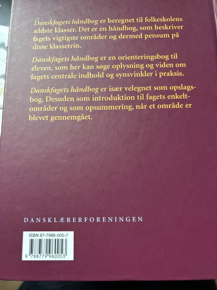 Danskfagets håndbog er en omfattende guide, designet til de ældste elever i folkeskolen, som giver et overblik over de centrale elementer i faget dansk. Bogen fungerer både som introduktion til de enkelte delområder og som en praktisk opslagsbog, der hjælper med at få styr på de væsentlige emner, man skal kunne til dansk. Bogen er inddelt i tre dele. Den første del behandler emner som sprog, sagtekster, fiktion, skrivning og det talte sprog, mens den anden del fokuserer på grammatik – fra bøjning af ord til opbygning af sætninger og den praktiske anvendelse heraf i læsning og skrivning. I den tredje del findes et alfabetisk dansk-leksikon, hvor eleverne kan slå centrale begreber op, herunder forskellige genrer som artikel, eventyr, gyser og splatter. Publikeret af Dansklærerforeningen i 2004 og udført som en robust hardcover-bog med 312 sider, er denne håndbog et essentielt redskab for alle, der ønsker et solidt grundlag i faget dansk.